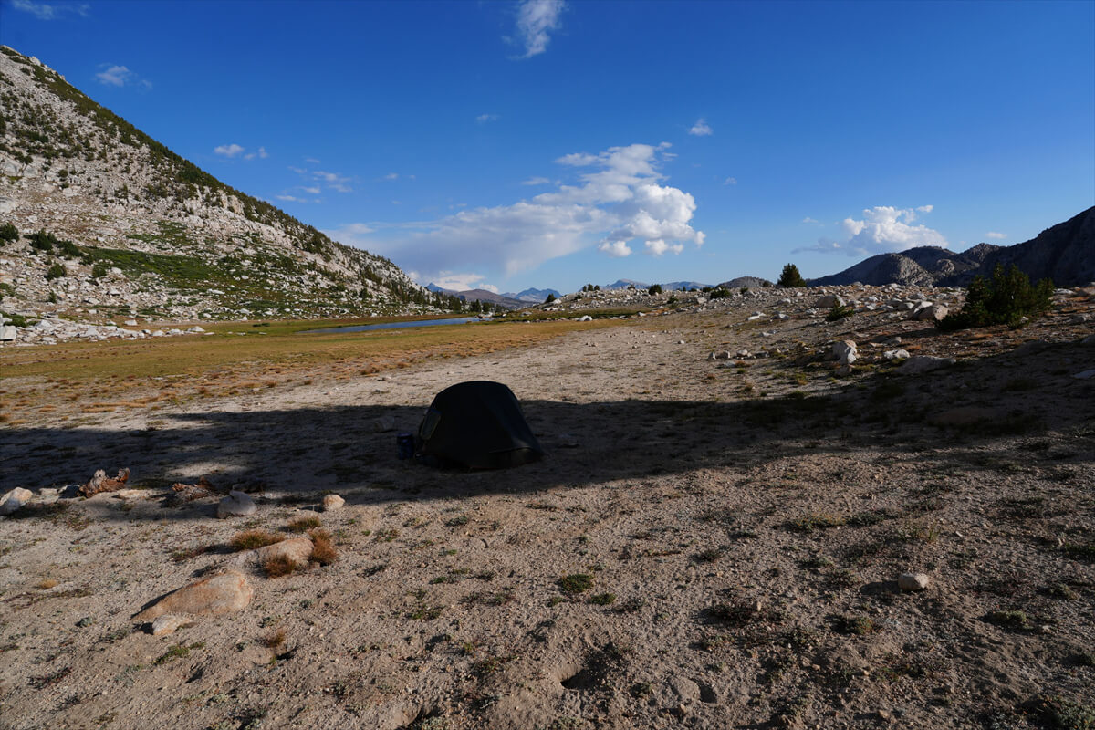 シルバー・パス・レイクが見えた。時刻は 5 時過ぎ。困ったことにお気に入りの場所には誰かいる。あの苦手のおばさんがいると大変だ。右手を見ると、最上流の湖があり、その近くに日陰がある。トレイルが少し近い欠点はあるが、人は通りそうにないので、テントを設営した。それが図 12.24 である。テントは日陰にある。