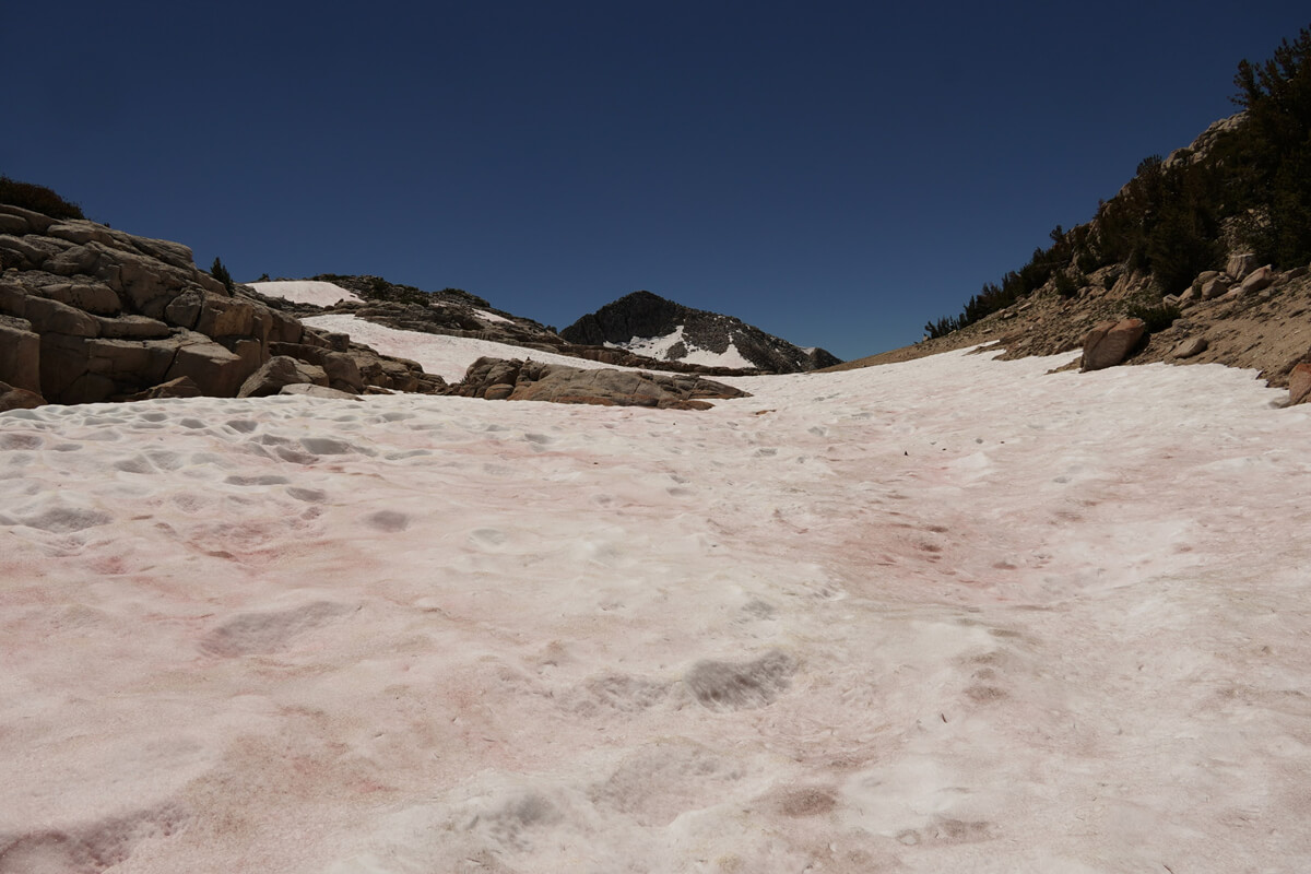 シルバー・パス・レイクにはまだ日が当っていない。パスの登りは緩く二段階に分かれている。キャンプ・サイトからしばらく登ると、傾斜が緩くなり、例年は雪渓が残っている。今年は干上がっていた。それから少し登りがあり、左手に無名の湖がある。今年は干上がってはいないが、かなり水が少なかった。写真はとったが、例年と比べると、冴えない印象である。