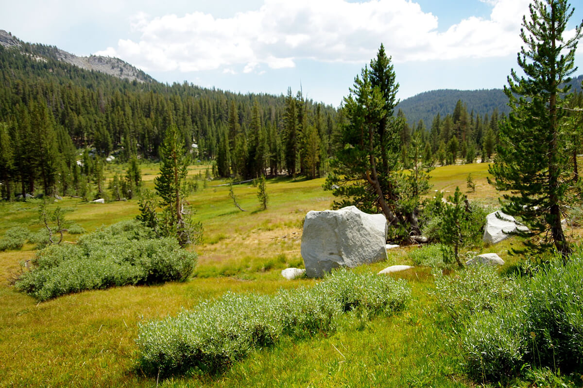 ランチ・タイムは 30 分程度である。歩き始めて 30 分ほどすると、きつめのスイッチバックが始まるが。トレイルは正面の岩を回避してスイッチバックして、川沿いの狭いメドウに到達する。図 12.19 のポケット・メドウである。