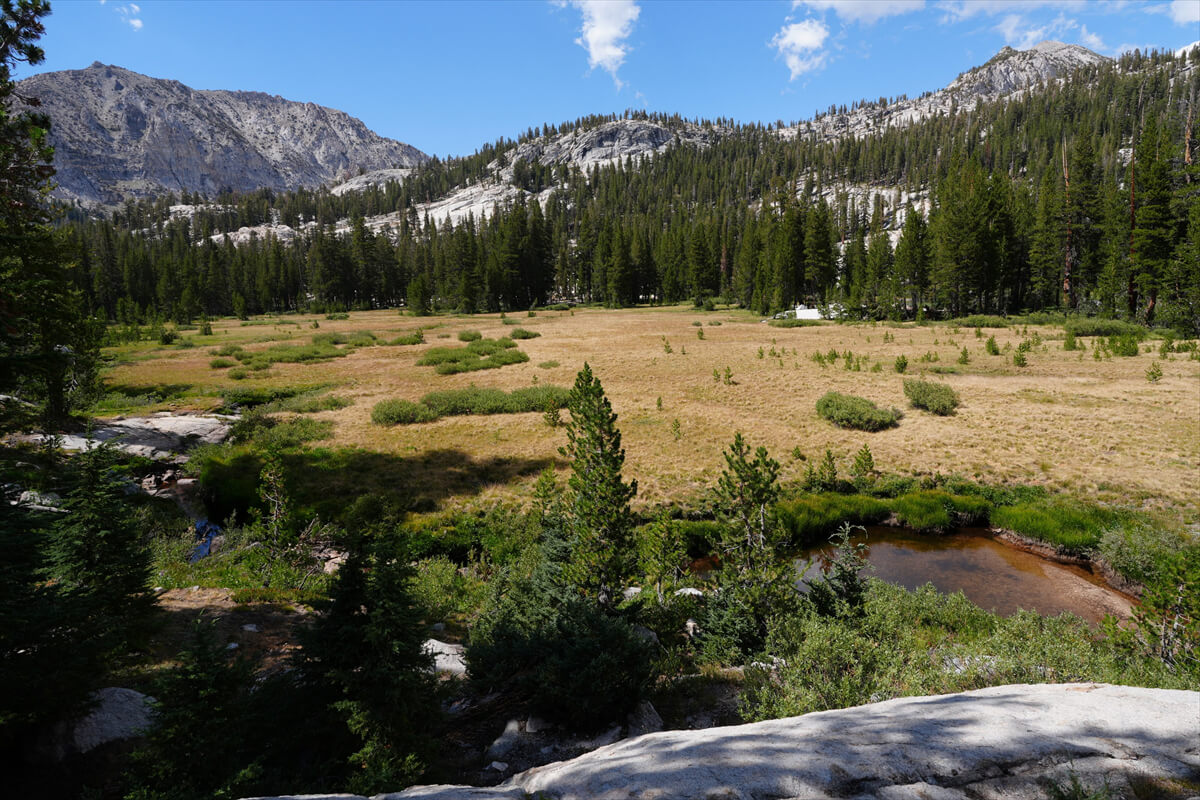 シルバー・パス・クリークの厳しいスイッチバックを終えると、広いメドウが広がる。なぜか地図には名前が記載されていない。例年の休憩場所からの写真を図 12.23 に示す。水は近いが少し下を流れている。