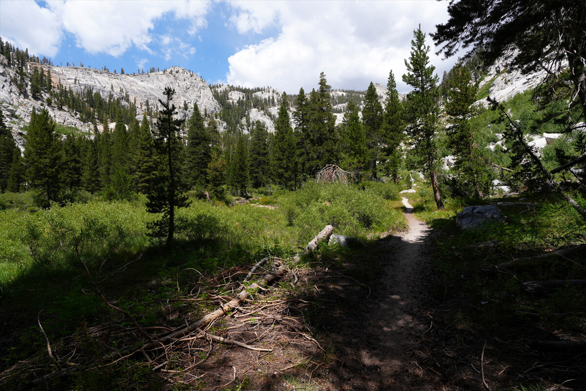 なだらかなトレイルを進むにつれて、少しずつ、高度が上がっていく。クリークを軽く渡渉して標高 3,000 m、時刻は 3 時 40 分になった。歳を取ったから、今年はシルバー・パス・レイクまで行けないと思ったが、どうも行けそうである。クリーク沿いにキャンプ・サイトはあったが、まっすぐに行くことにした。