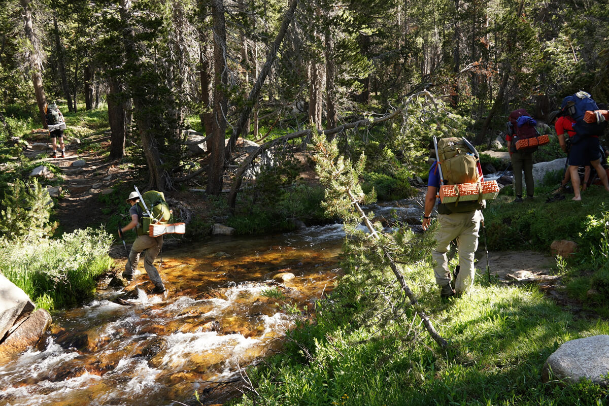 分岐からトレイルは山に向かい、かなりの傾斜を登っていく。最後にスイッチバックがあり、丘を越えると、広いメドウになる。トレイルは少し高度を下げて、最初の渡渉がある。ドライの夏ではほぼ水がないが、2023年の夏は水嵩が最大であった。それでもひざ下である(図12.31)。