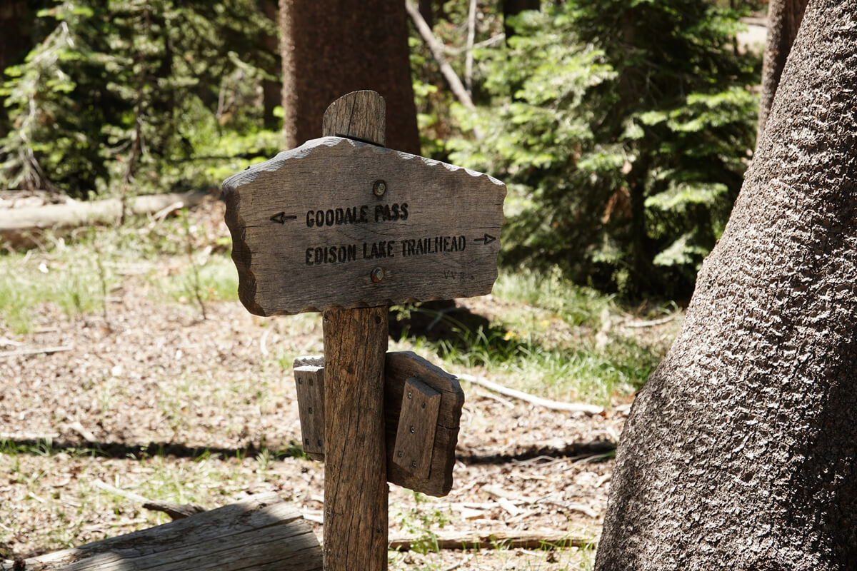 図12.29 のような立派な橋があり、トレイルは二つに分かれる。グッデイル・パスに向かうのは山側のトレイルで、岸に沿って歩くと、レイク・エディソンのフェリーの発着場を経てJMT に合流する。
