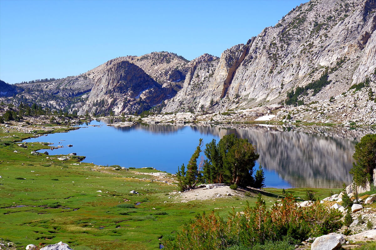 VVR からは標識にしたがってトレイルを歩く。しばらくすれば林道に合流し、トレイルヘッドに着く。アンセル・アダムスのウィルダネスである。トレイルは二つに分かれる。湖岸に沿うトレイルを歩く。しばらくはパイン・ツリーの間を歩く。メドウも点在する。