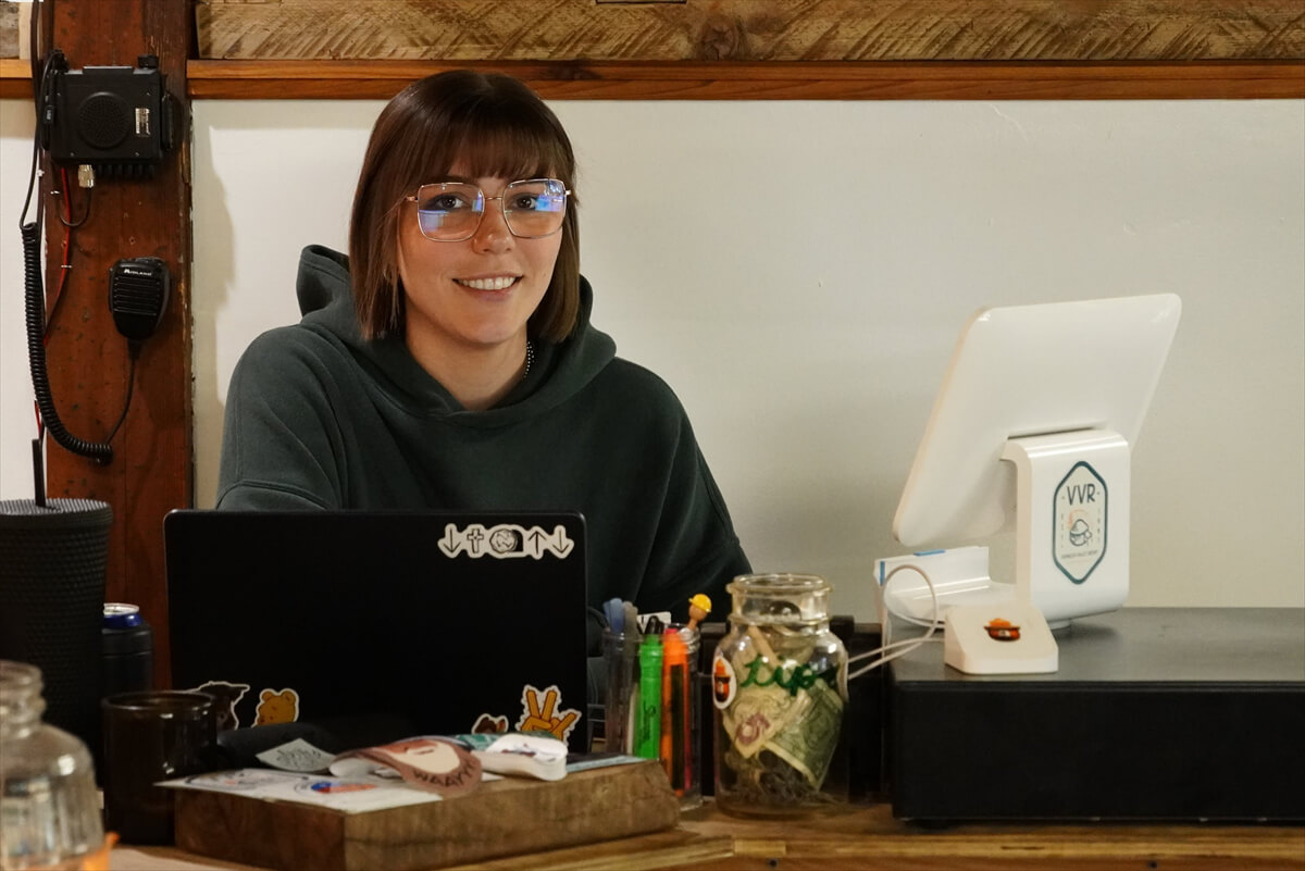 ここにだいたいは綺麗な受付嬢(図 12.3)がいる。名前を登録して、説明を聞いて、チェックインはお仕舞である。 WiFi、シャワー、ランドリーは別料金なので、ここで申請して利用する。食堂を利用する時はここで注文する。2023 年の受付嬢は素晴らしい記憶力で、チェックインした全員の顔と名前を覚えていた。これにはびっくりした。この人は数年勤めていた。