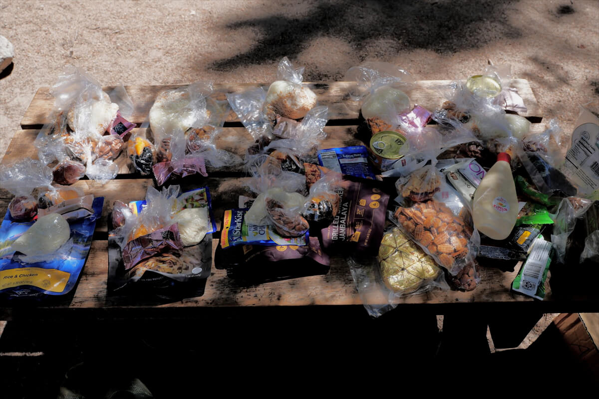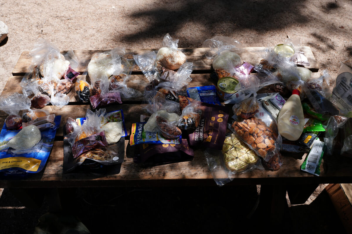 ひと騒ぎが終わったで、ハイカーズ・ボックスをかき回し、VVR の受付に行って補給物資を受け取ってきた。テーブルの上に 8 日分の食料を並べた。図 12.13 がそれである。10~15 ドルのフリーズドライのパックも四つ、ツナパックも三つ拾った。エナジー・バーは 10 個ほどある。
