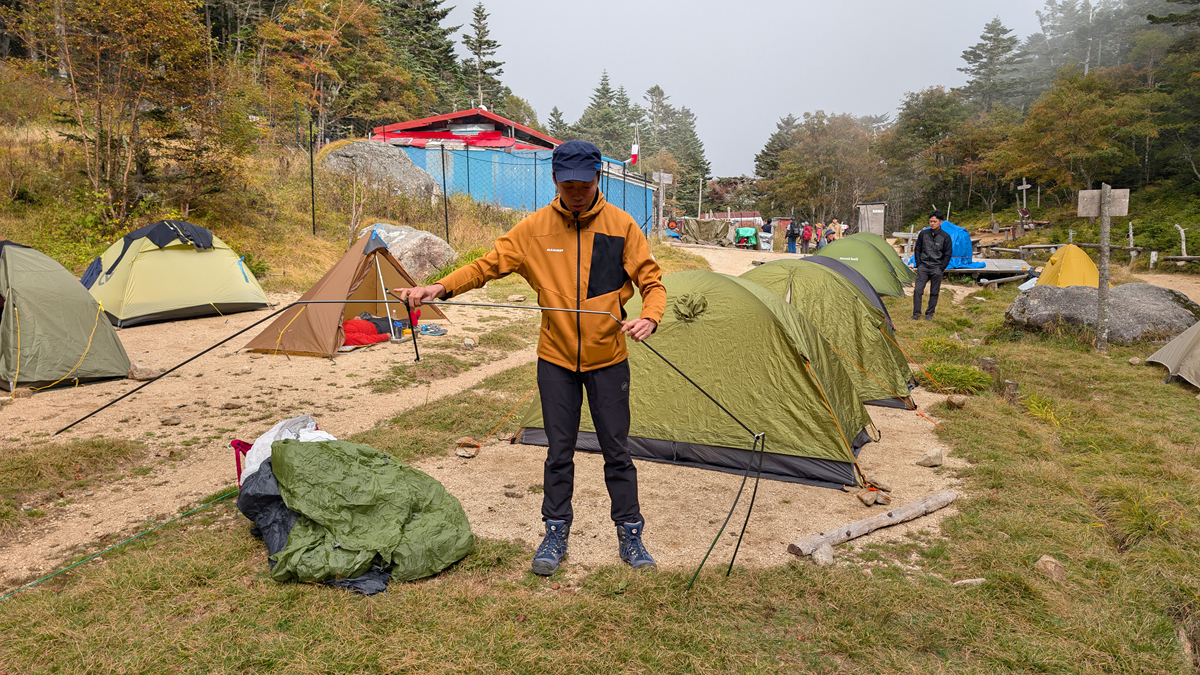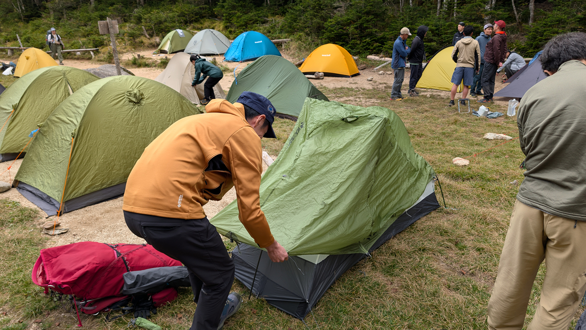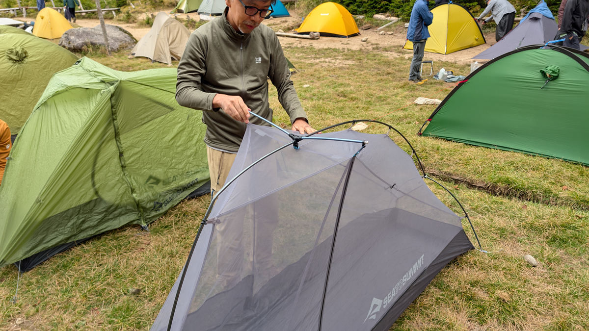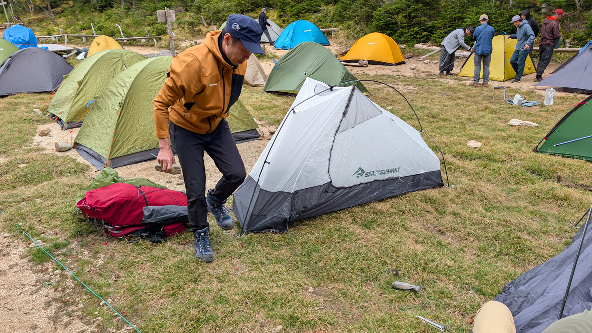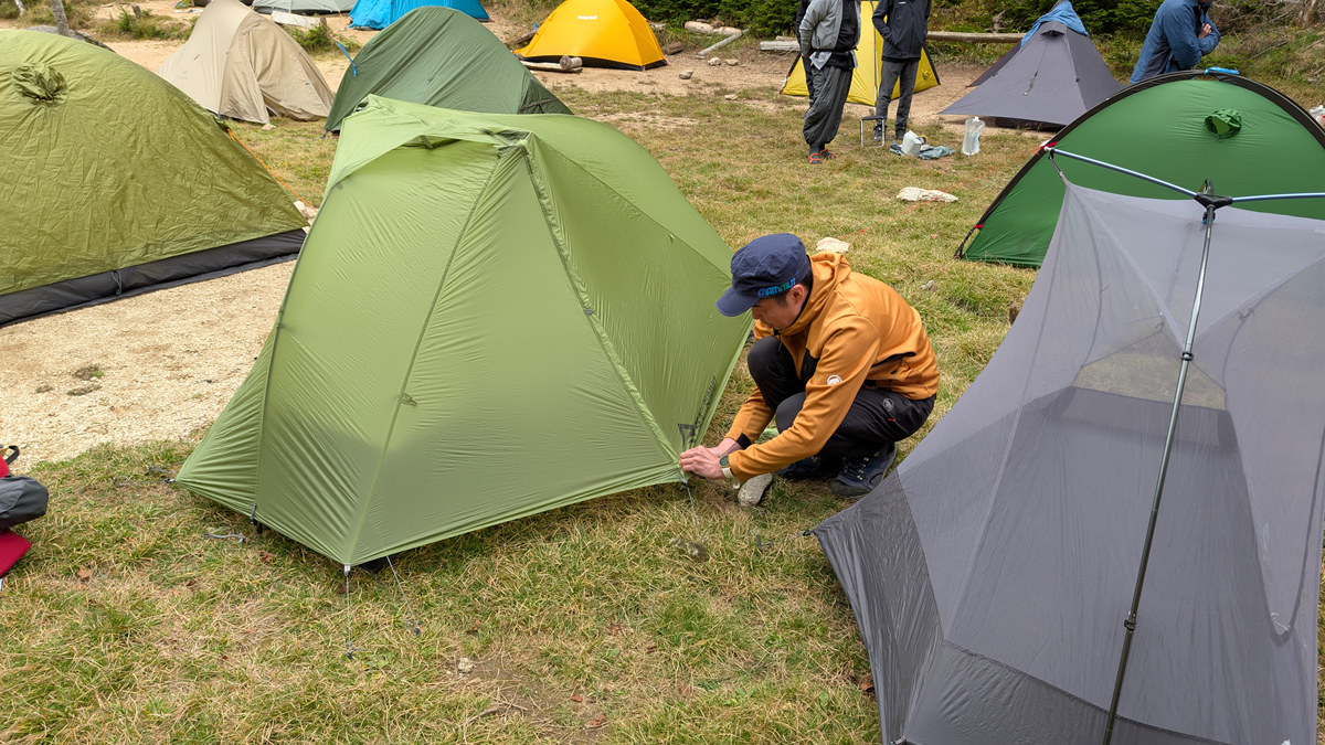 Looking around, the tents were mostly Montbell and Arai Tents. There were also a fair number of NEMOs. There were also Heritage, Finetrack, Arata, and one or two ZEROGRAMs. I had expected this to some extent, but no one was pitching a Sea to Summit tent, and as expected, most of the tents were domestically produced. Even though Japan has so many excellent tents from around the world, I think Outdoor Gearzine needs to put in more effort to spread the word (there was a single-walled one-pole shelter nearby that seemed to be pushing the limits by any standards, but I wonder if the person who used it survived the night).