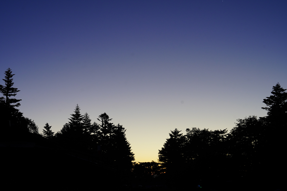 Stop for a moment and admire the orange glow of the Shiramine Sanzan mountains in the morning glow.