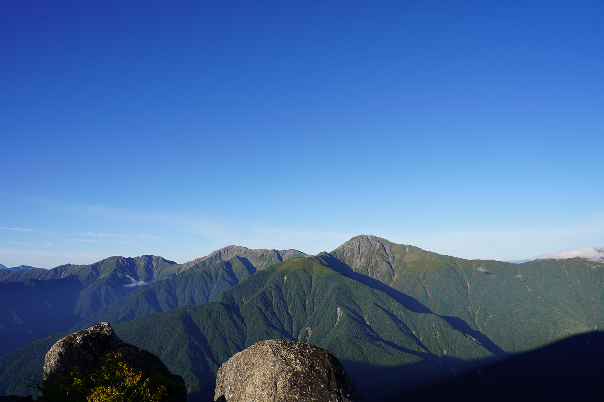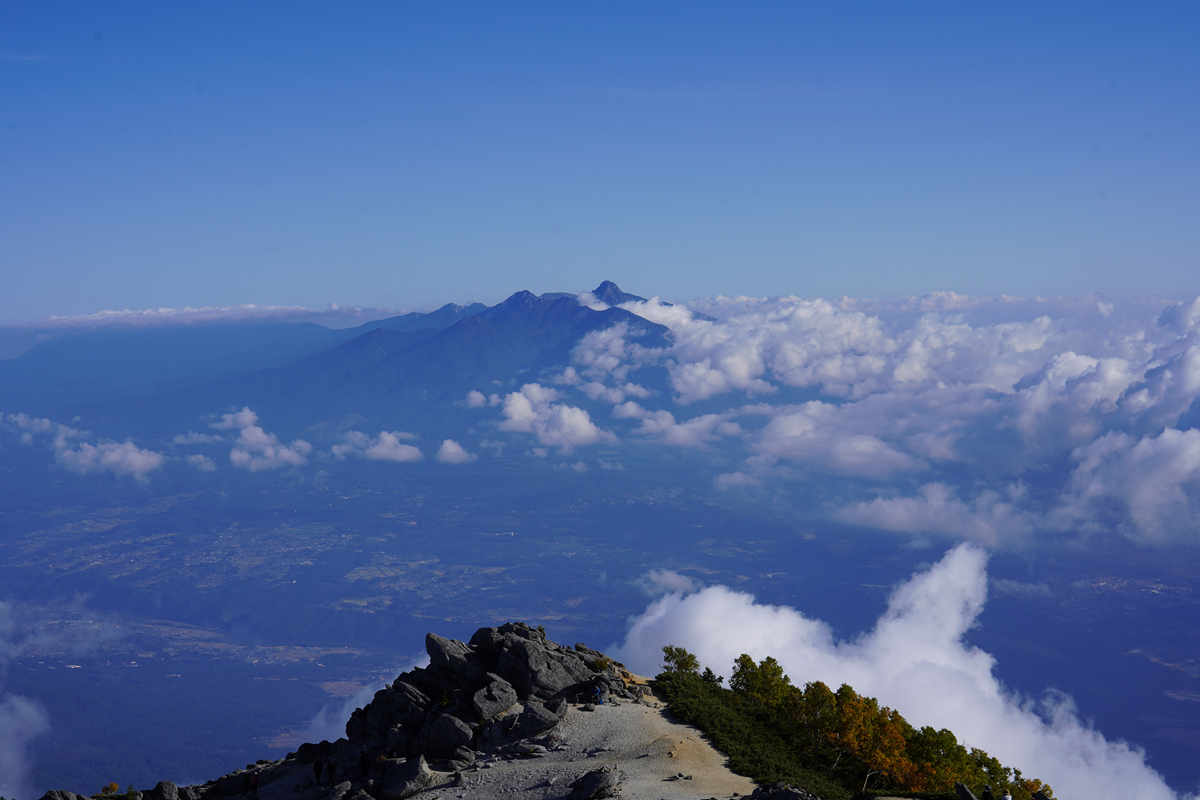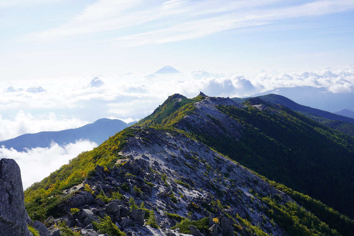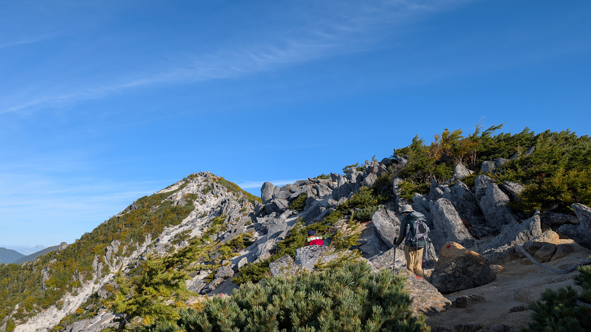 About an hour after we set off, we finally emerge from the forest and emerge onto a ridgeline with a mixture of rocks and gravel. The blue sky spreads across the ridgeline, and we finally get to see the magnificent panorama of the Shiramine Sanzan mountains that we had been wanting to see the day before.