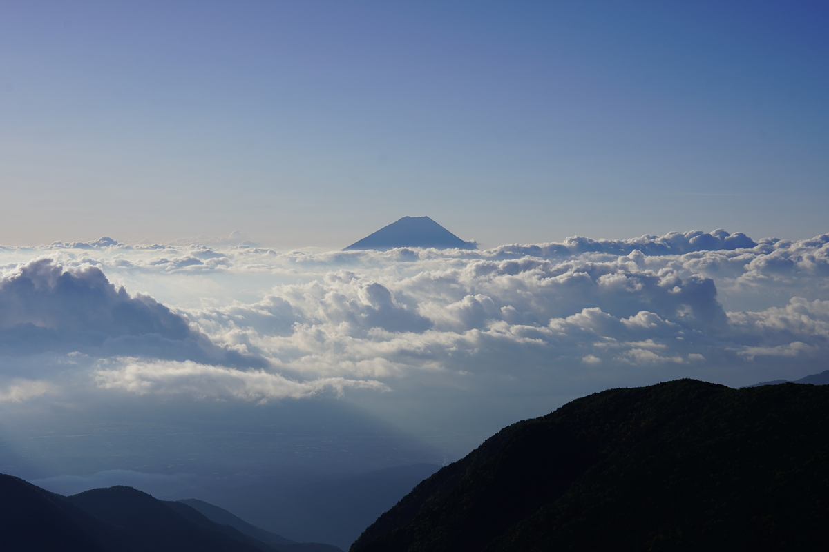 Below you, a sea of clouds spreads out, creating dynamic shadows. Mount Fuji floats above it. It's a view that makes you want to take pictures no matter how many times you see it.