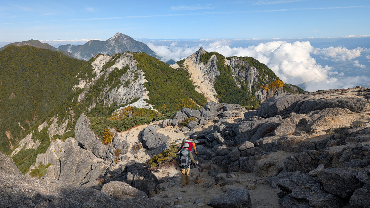 We will walk along the ridgeline typical of the Southern Alps, where a massive, deep, and magnificent landscape unfolds, and proceed to Mt. Yakushi and Mt. Kannon.