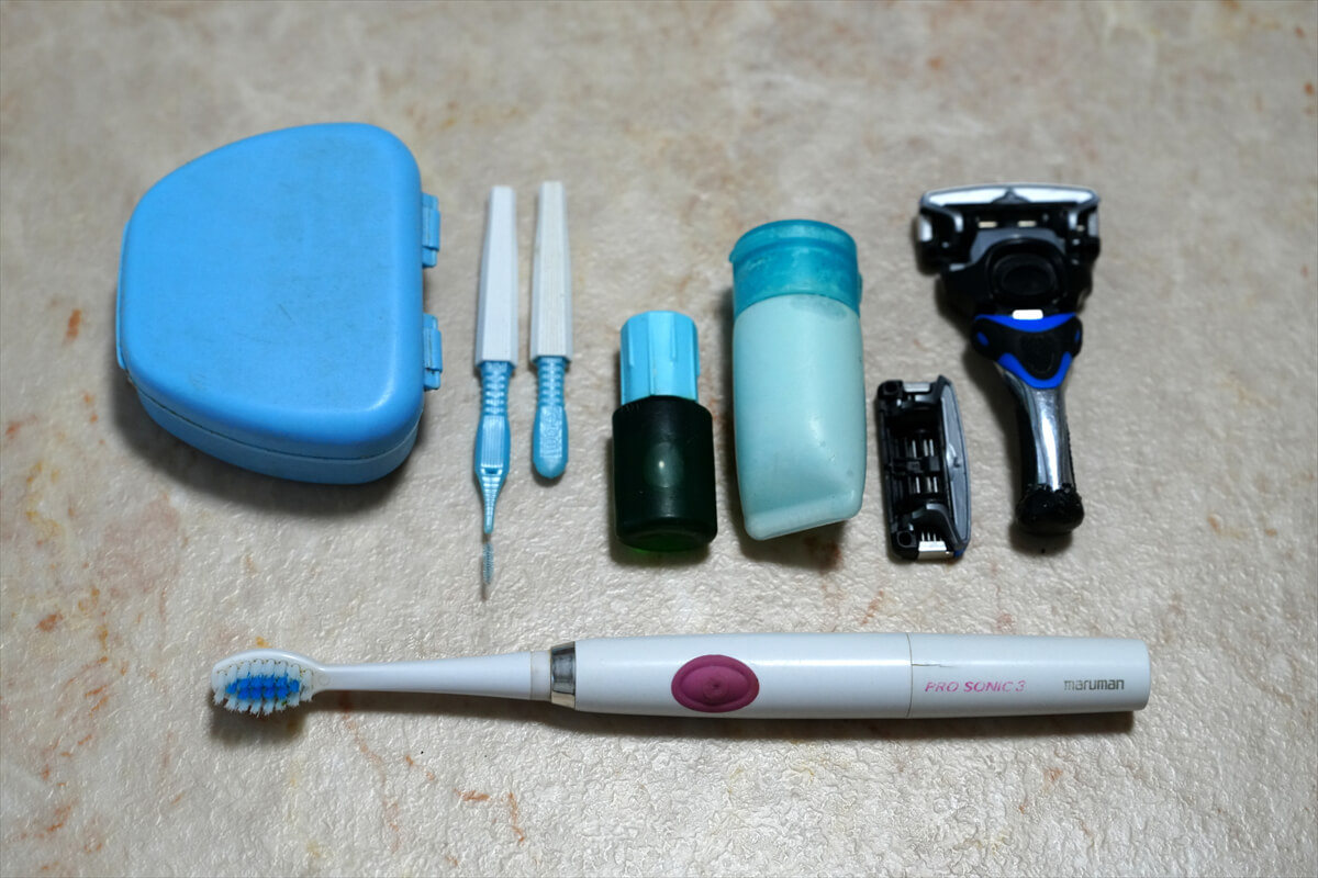 My toothbrush set is shown in Figure 10.26. The toothbrush is a very cheap electric toothbrush that runs well for two to three weeks on a single AA battery. Since I'm elderly, I also have an interdental brush. Because my teeth move a little every day, I wear a bite plate to maintain my bite while I sleep. The plastic case is where it's stored. The razor is chic and shaves well without causing any cuts. Because it's double-cushioned, the handle isn't necessary, so I cut it off