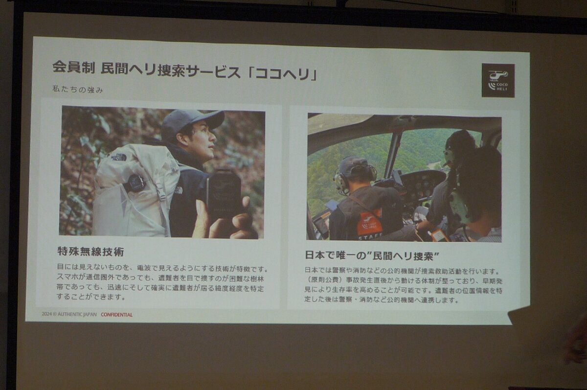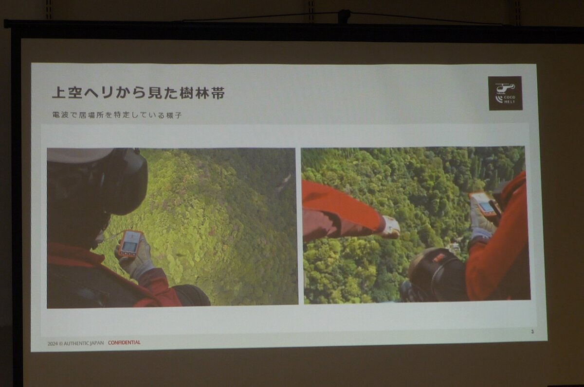 "In the past, when searches were conducted using private helicopters, the search was done visually, but if the scene was as shown in this slide and the situation was like this, even if you looked through the forest, you wouldn't be able to confirm where the missing person was, right? But with the radio waves from Cocoheli, we can determine their location reliably and quickly! All we have to do is pull in the radio wave thread."