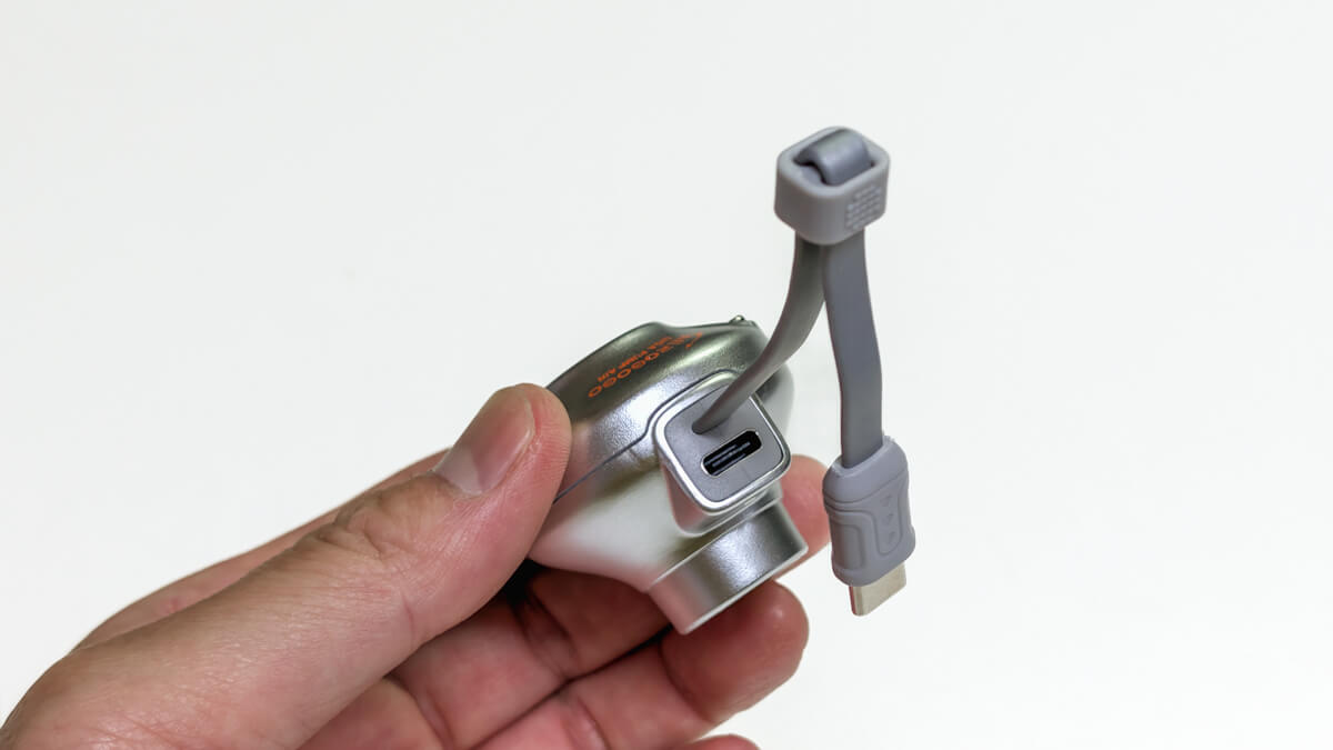 When carrying it around, you can plug the cable into this USB-C port and hang it on a carabiner (center of the photo below).