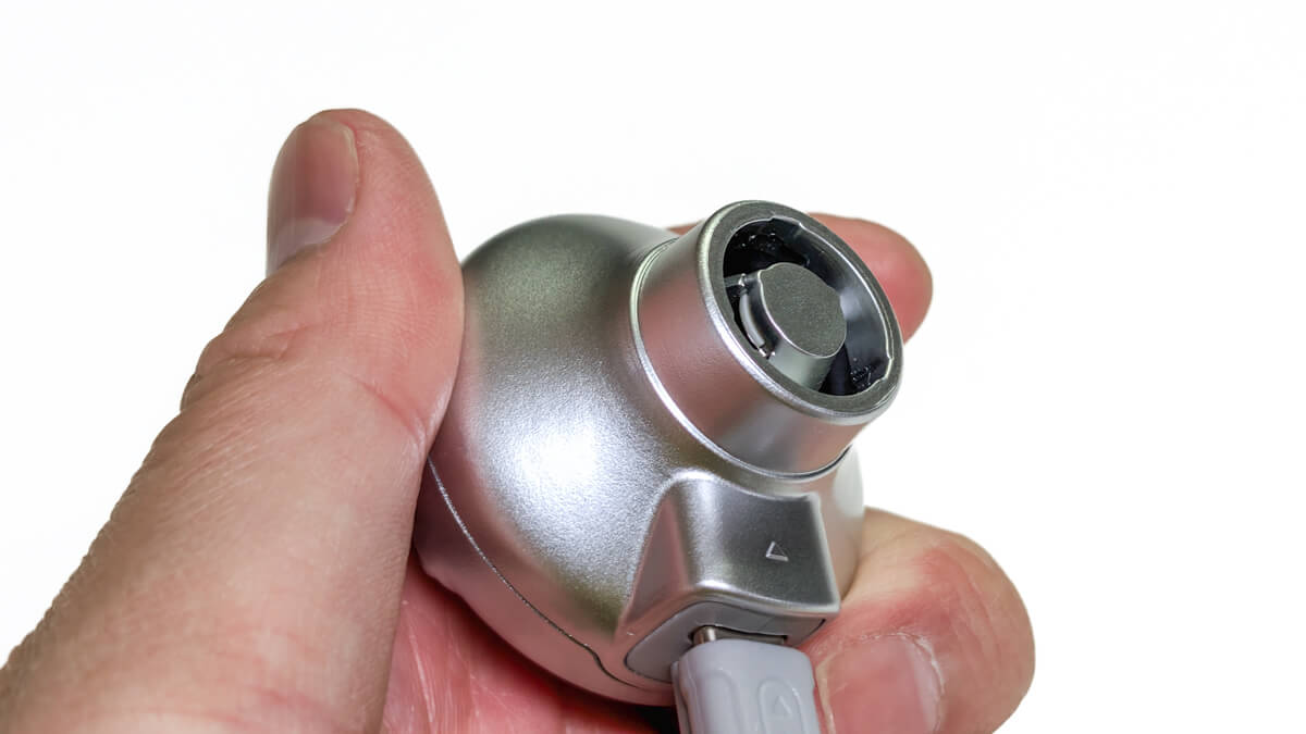When you hold it, just as rumored, it's so light (28 grams) that it's practically weightless. The device itself is about the size of a thumb, and even with the cable it fits in the palm of your hand.