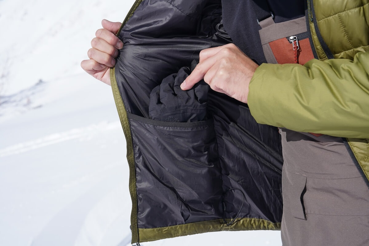 The inner drop-in pocket is large enough to fit gloves snugly. When preparing for a ride, storing your gloves in it prevents them from getting wet or cold from the snow