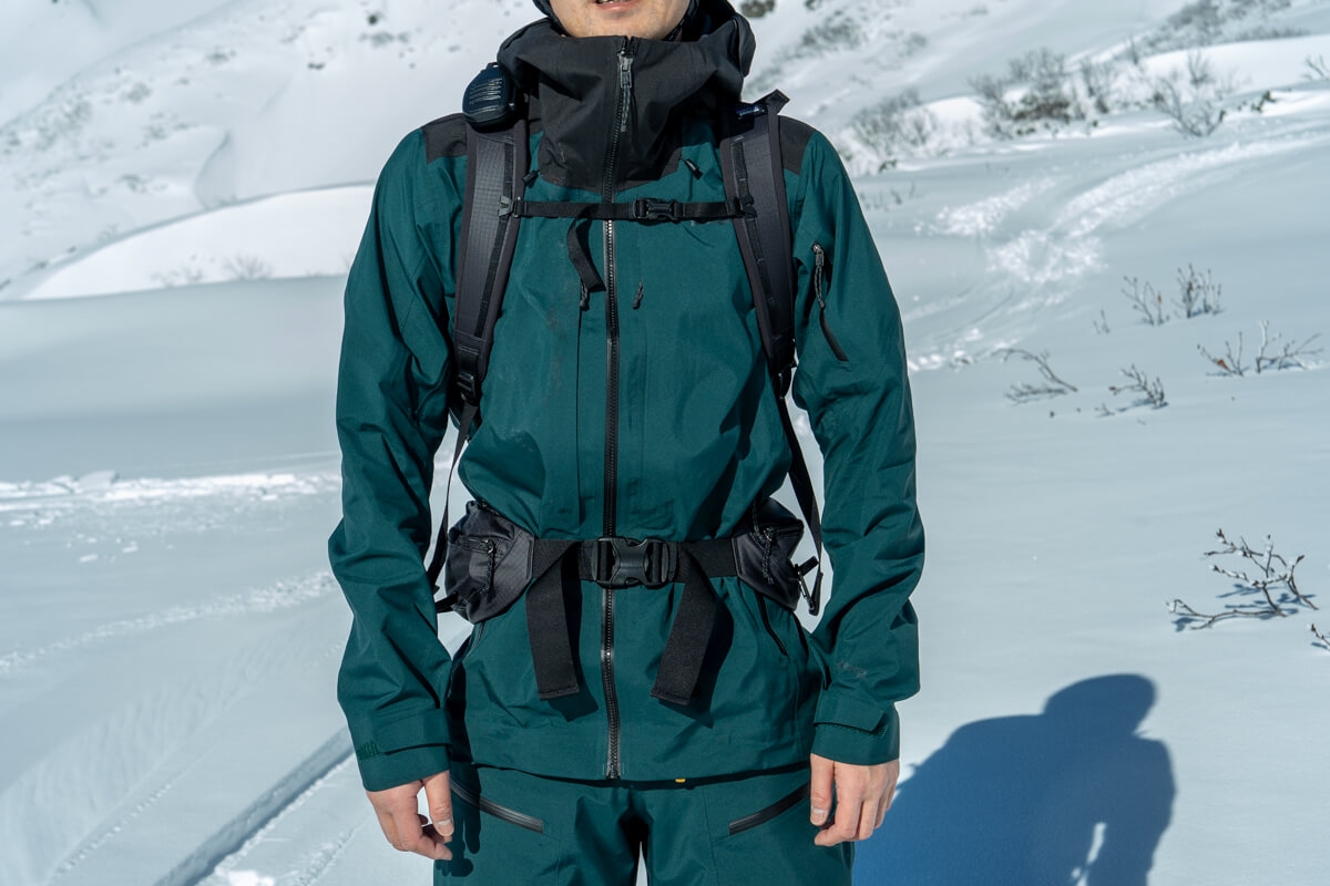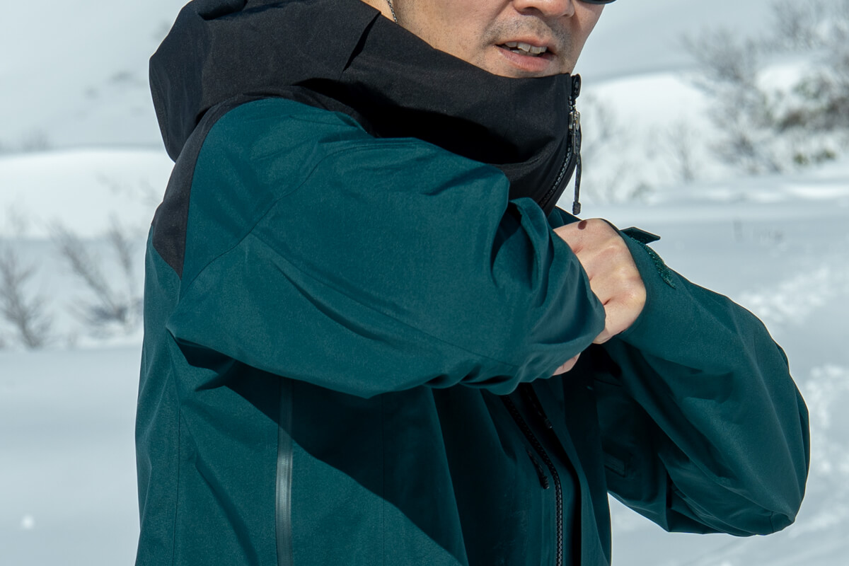 For example, even when performing large, complicated movements such as moving your arms up and down while working with poles, raising your thighs high while hiking uphill, bending over to take items in and out of your backpack, or changing into ski mode on a slope, you can move around stress-free without worrying about the fabric feeling tight, and combined with the lightness of the jacket itself, you can do so.