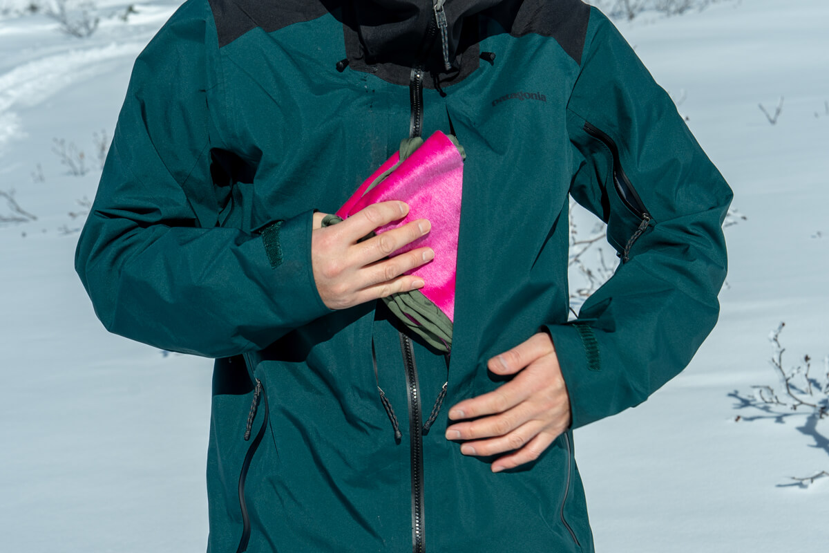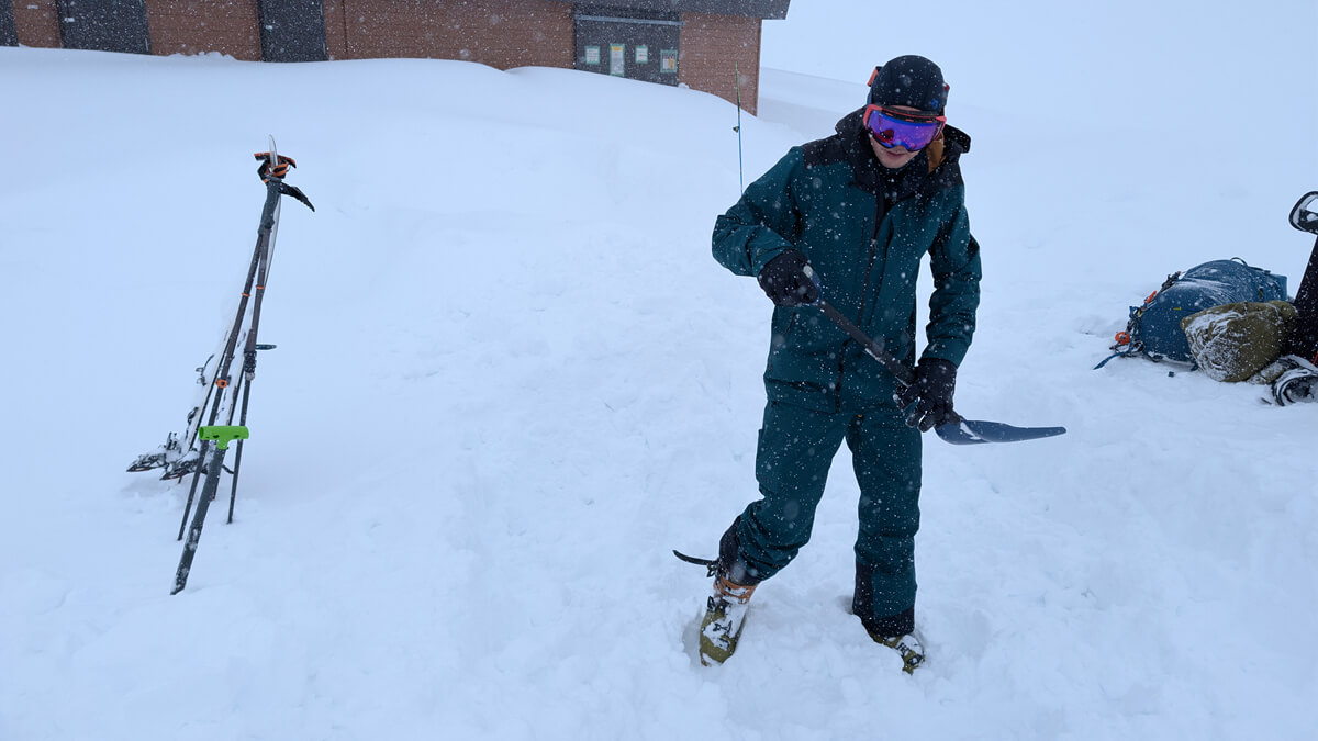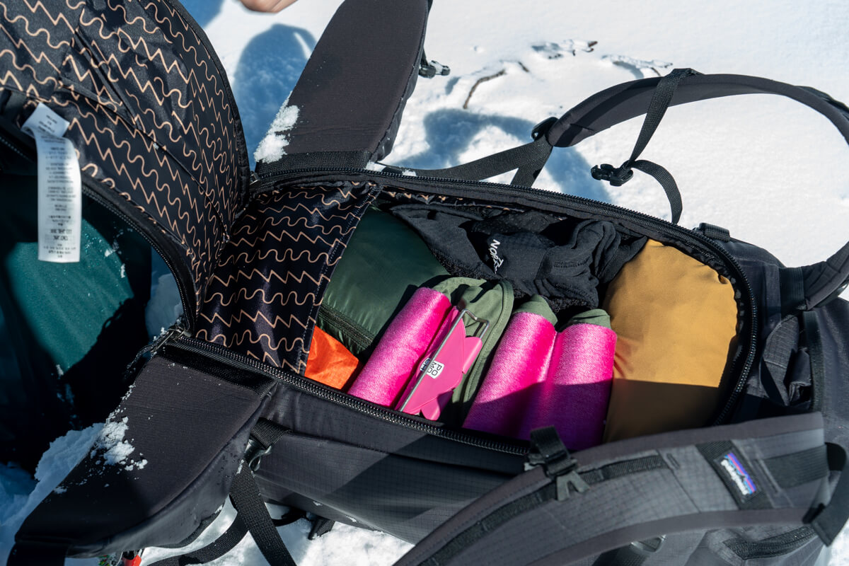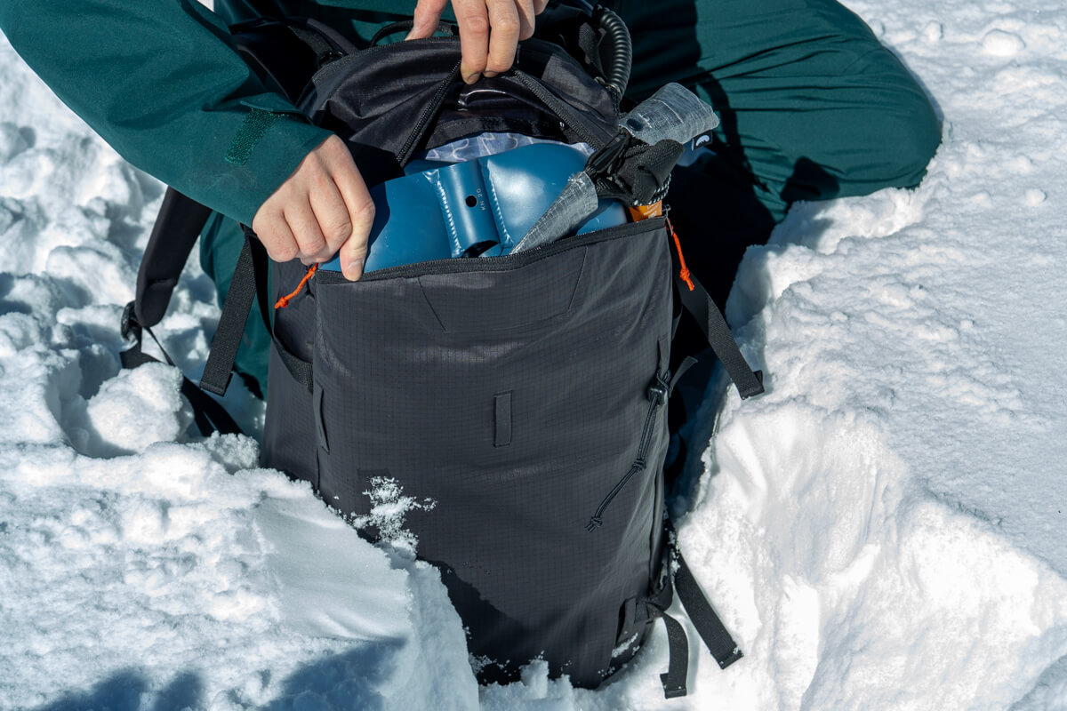 The pockets for storing avalanche gear such as snow shovels and probes are also spacious and easy to access, so you can safely store large shovels and other gear together (see photo below).