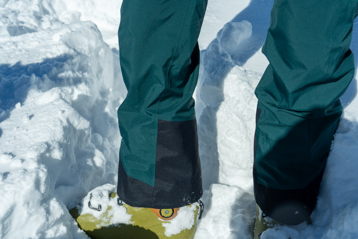 The inside of the pants is reinforced with crampon guards (see photo below), and of course there are snow gaiters on the inside of the cuffs to keep snow out.