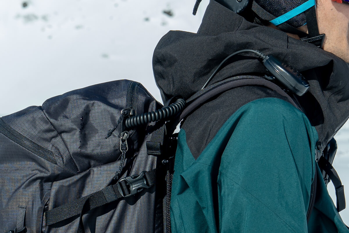 The walkie-talkie is placed in the top zip pocket for the goggles, and the speaker microphone is extended.