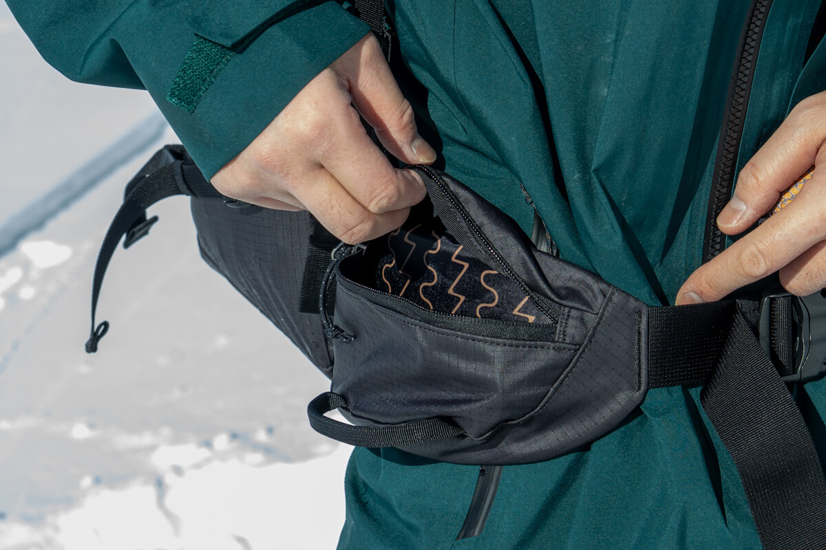 In particular, the zipper pockets on the left and right chest have significantly increased capacity, and are now large enough to easily store fat ski climbing skins. This allows for quick mode changes without having to take off the backpack. There is also an inner pocket on the right chest for a smartphone or walkie-talkie (see photo below).