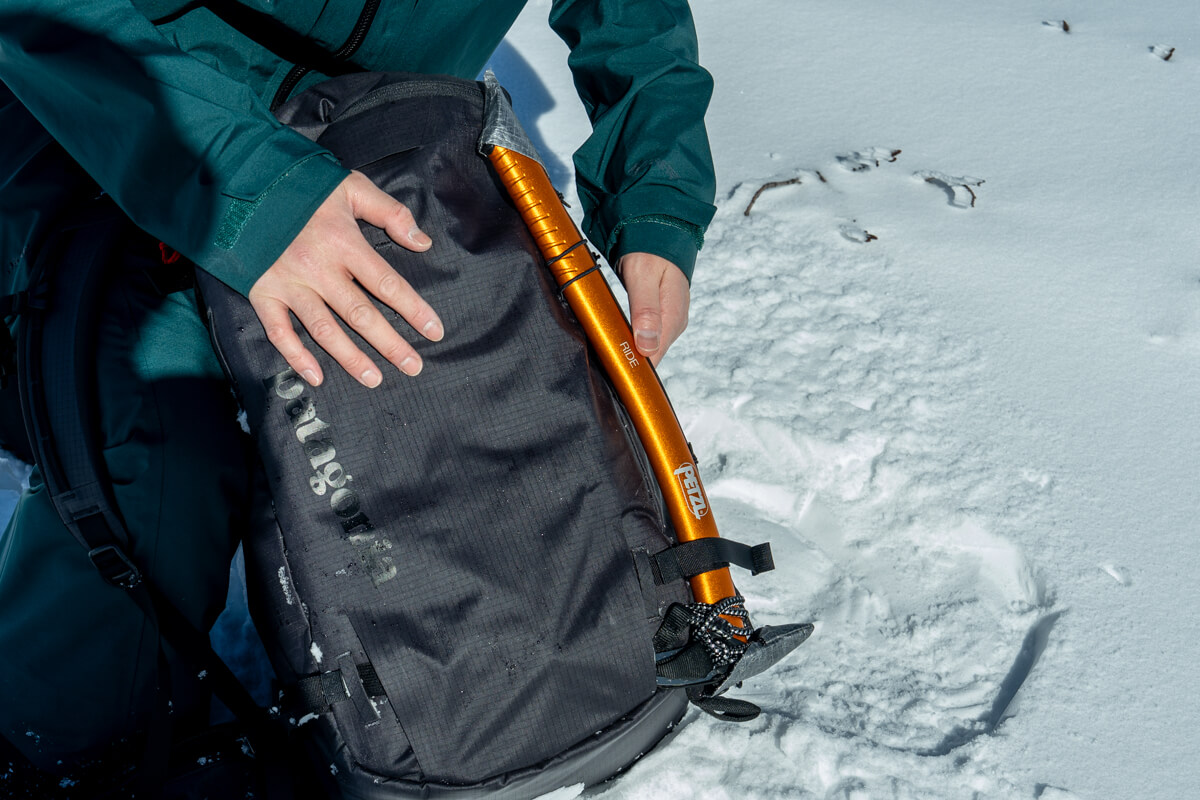 There is ample space to store avalanche safety gear, and this time I was able to store an ice axe as well.