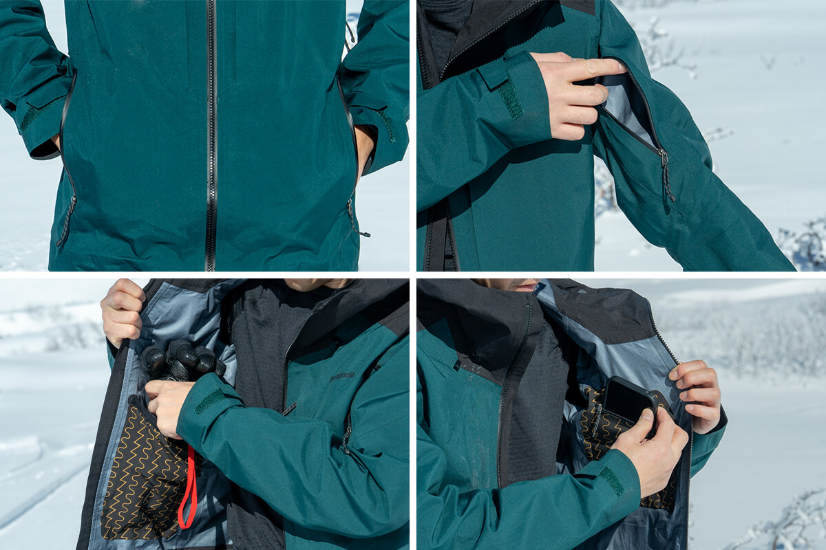 The left and right chest pockets, which are the most accessible, are large enough to hold climbing skins.