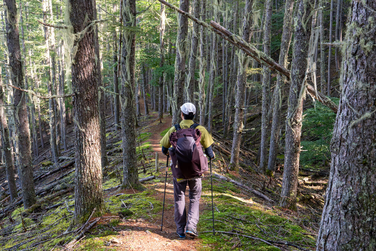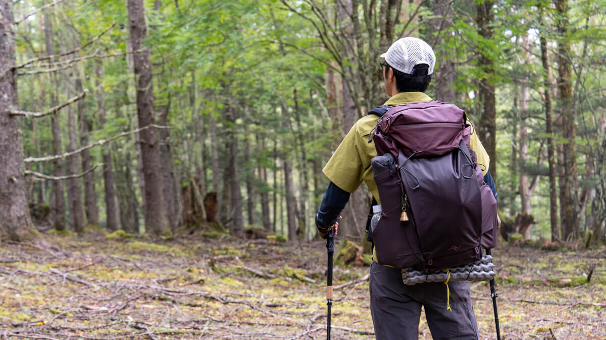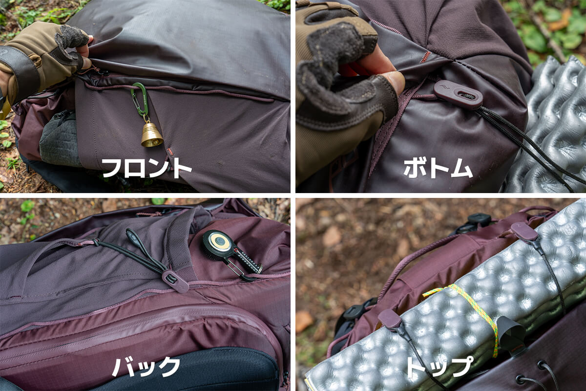 Cord rails are installed everywhere—front, back, top, and bottom—so you can hang hooks almost anywhere you can imagine. The standard carry cords come in two varieties: a long, non-stretchy cord and a short, stretchy cord. By making full use of these, you can secure items like tents, sleeping bags, and mattresses to the bottom or top, poles and axes to the front or sides, or tripods and poles in the side pockets more securely. This allows for a much larger load capacity than the official 45-liter capacity, and honestly, with this, I felt like long hikes were possible.