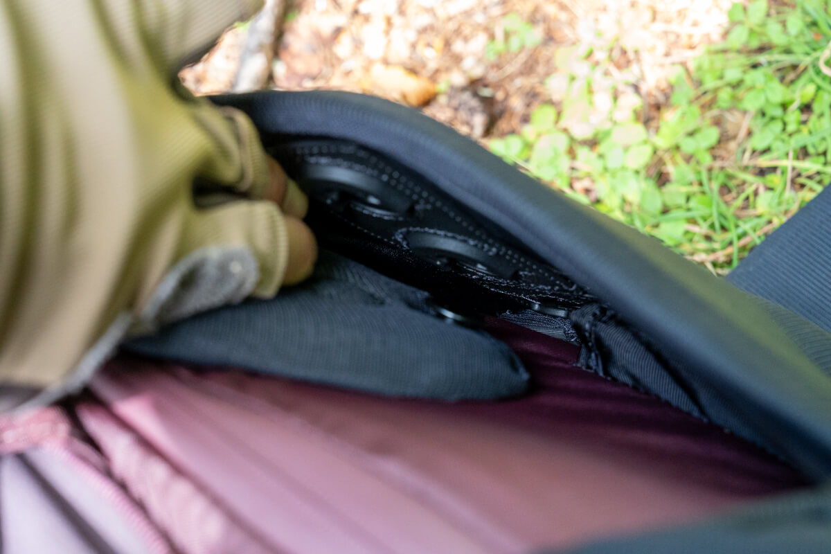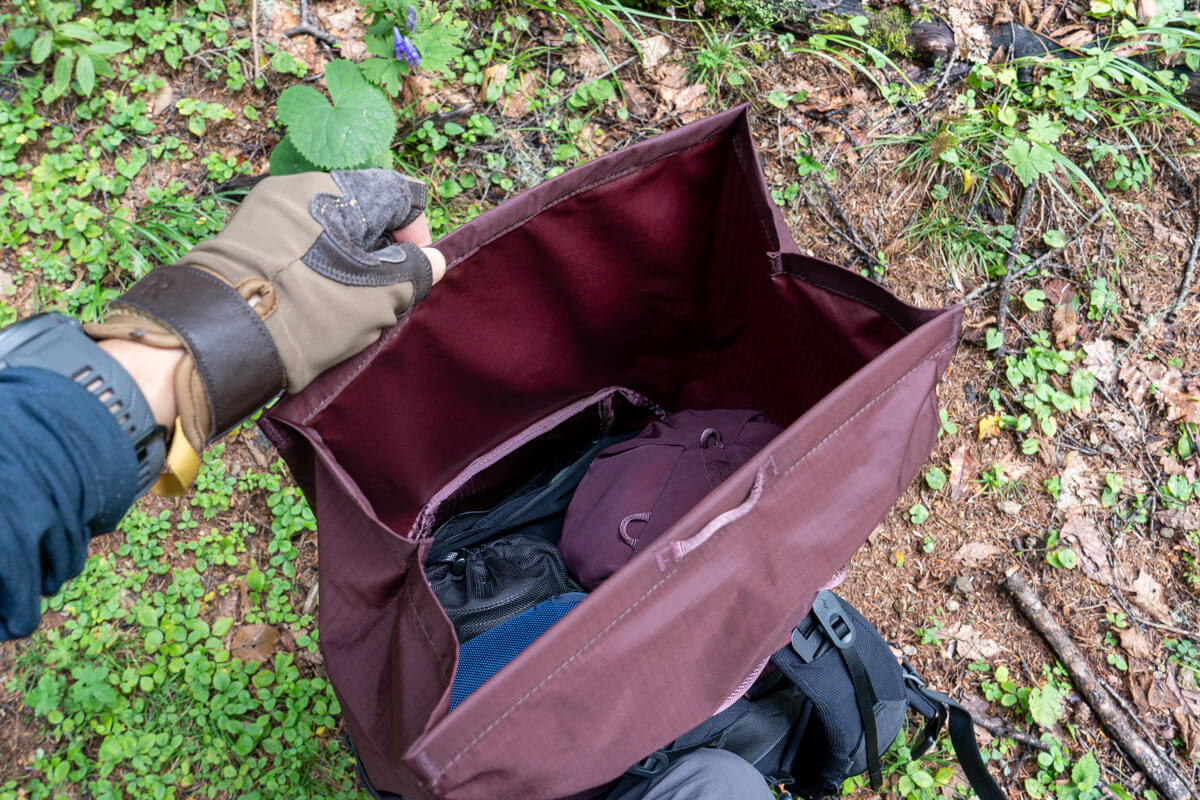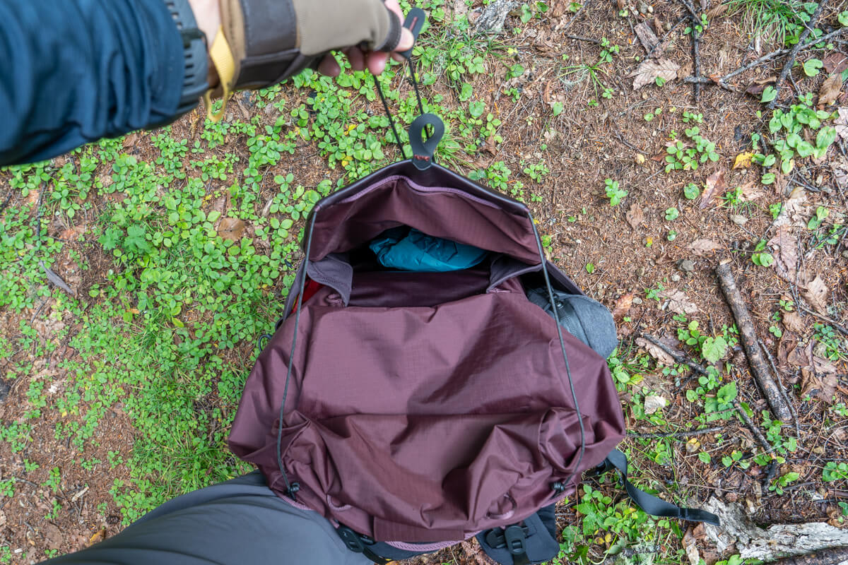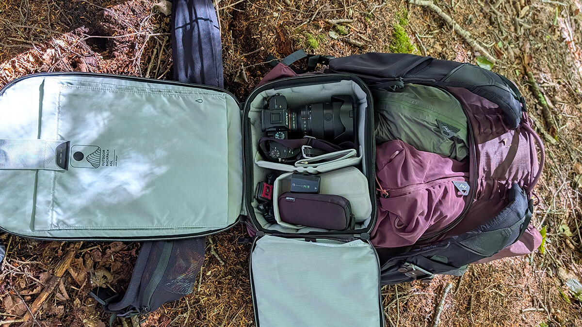 When fully open, the opening is just the right size to fit Peak Design's camera protective case, the Camera Cube, and it can also be connected and secured to the backpack.By combining these, you can safely carry your complicated camera equipment on the mountains and easily take it in and out (see photo below).