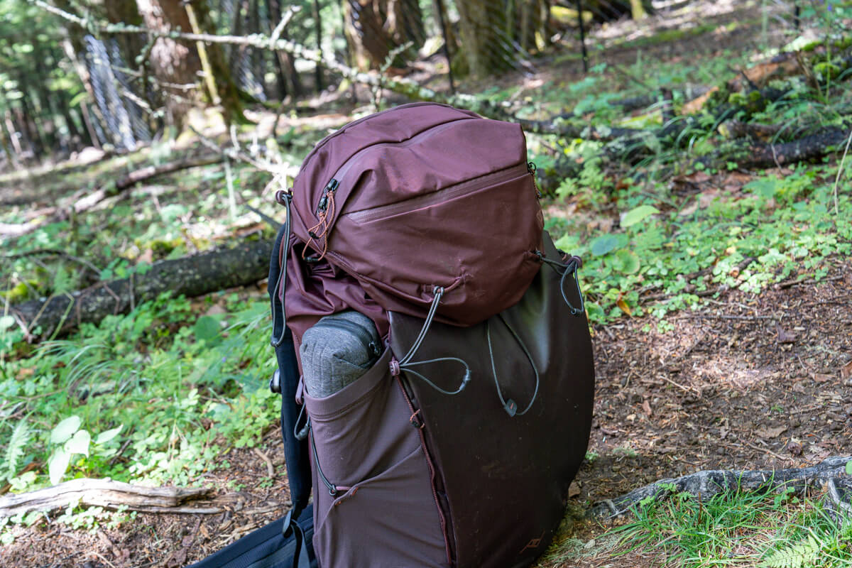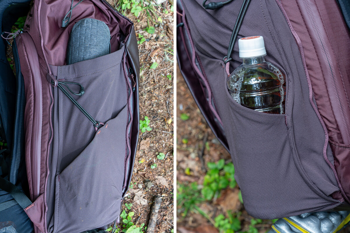 The 45L model has an additional shallow stretch pocket that can be accessed from the side. In our test, we put a water bottle in this pocket and were able to take it out while standing without having to put the backpack down (see photo below. However, this shallow pocket shares space with the deep pocket, so please be aware that if you put a large item in the deep pocket, you will not be able to use the shallow pocket).