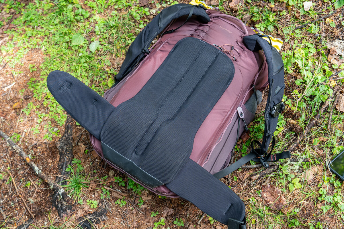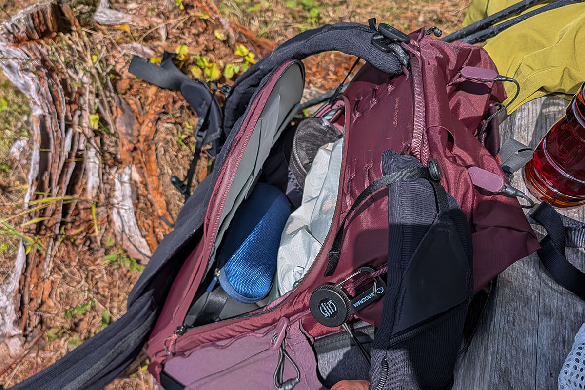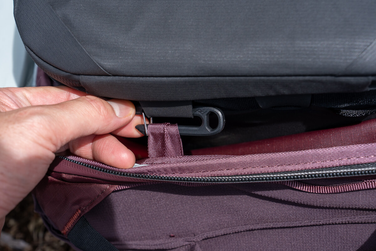 Another way to access the main compartment is via a clamshell system, where the back panel zips open completely (see photo above). Anyone familiar with backcountry ski backpacks will recognize this as "ah, that one." The zipper is arranged in an inverted U-shape around the back pad, and opening it all the way opens up the entire main compartment like a suitcase. As you can see, this makes organizing and packing your belongings extremely easy, and you can quickly access items at the bottom. Since Peak Design employs many photographers as its users, it's no surprise that they anticipate frequent access to camera equipment, so this design makes sense.