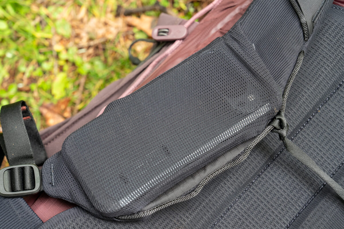 Furthermore, these "flex pockets" are placed on both sides of the shoulder harness with mesh material. These pockets, which were likely designed with inspiration from running vests, allow for quick and easy access to smartphones, snacks, and even soft flasks while walking (see photo below).