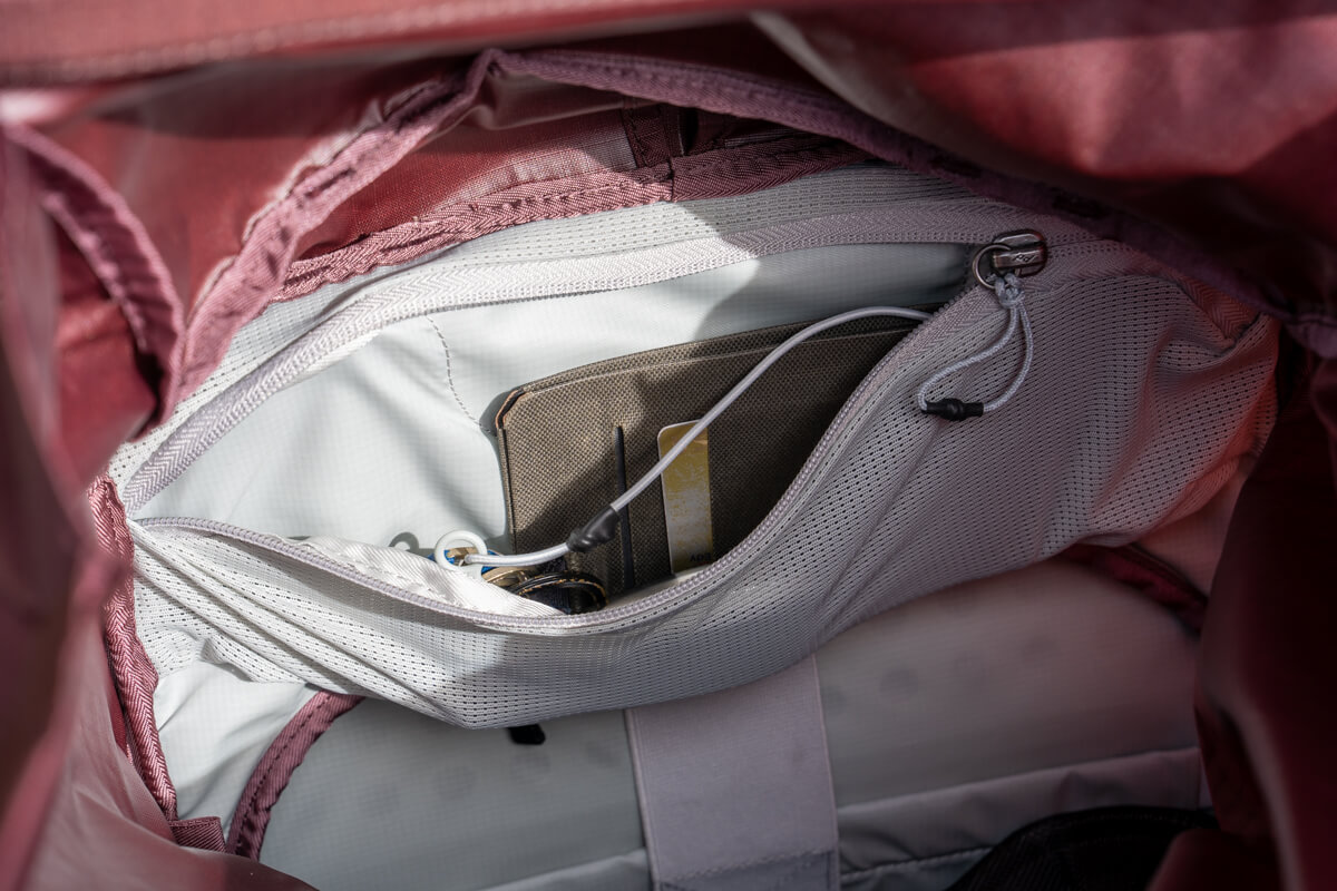 Only the 45L model has a mesh zippered pocket inside the main compartment. It's not large enough to replace a rain cover pocket, but it still functions well as a security pocket for keys, wallets, etc.