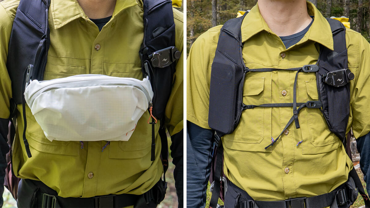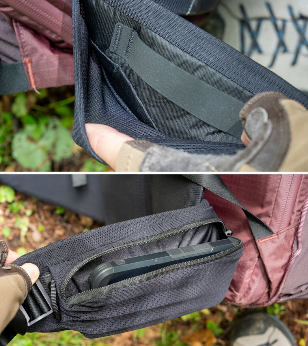 The hip belt pockets include a stretch pocket (top) on the right that can hold sunglasses and other items and also serves as an attachment point for Capture, and a zipper pocket (bottom) on the left that can hold a large smartphone.