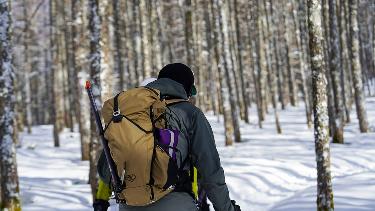衣食住を全て背負い、長距離を歩くようなシーンではできるだけ重量が軽いウェアを選ぶべきですし、BCスキー(スノーボード)において、ツリーランなどする際や、岩と雪のミックスされた険しい場所を登攀するようなシーンでは小枝にひっかかっても切れず、岩に擦っても穴の空かない耐久性が求められます。