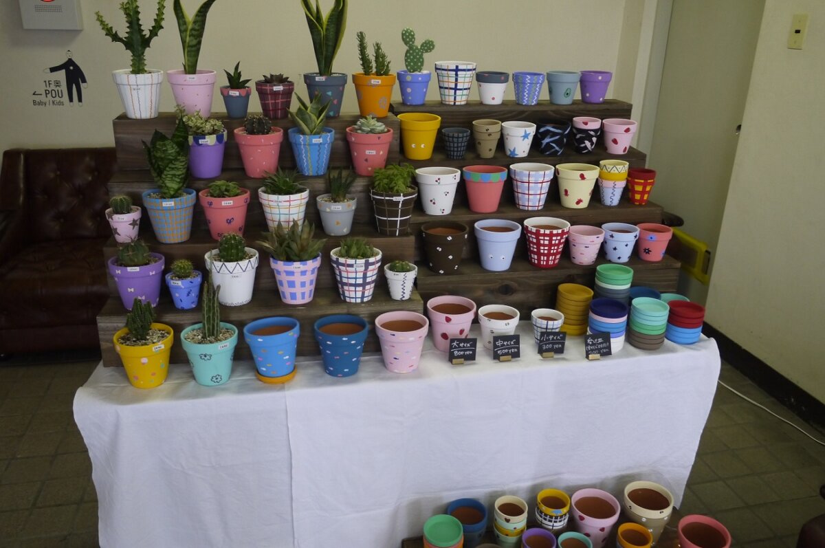訪問した時は入ってすぐのエントランスでこんなポップアップが開催されてましたよ、素焼きの鉢植えにオリジナルペイントを施したこちらはあおいろPOTさんの作品。植物大好きでそれに似合う可愛い鉢が欲しいなら自分で作ろう! という事らしいですよ、なんと作家さんはまだ中学生と若いのに精力的に活動してますねいい時代だ、それを支援してる親御さんも暖かい。