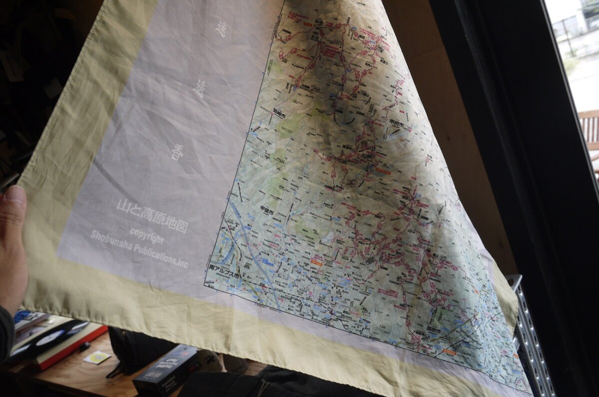 リリースされた時そうきたか! と思った皆様も多そうなまさかのコラボアイテム迷迭香/山と高原地図のMAP FUROSHIKI。その撥水加工された風呂敷は万能で使い方はアナタ次第、そして実際に3..5.6番車庫がある地域の山と高原地図28番/金峰山・甲武信・奥秩父でもあるので地図としても機能する。濡れても破れないコンパクトにもなると紙地図のその先にいるようなアイテムです。今後第二弾も出るのかも!?