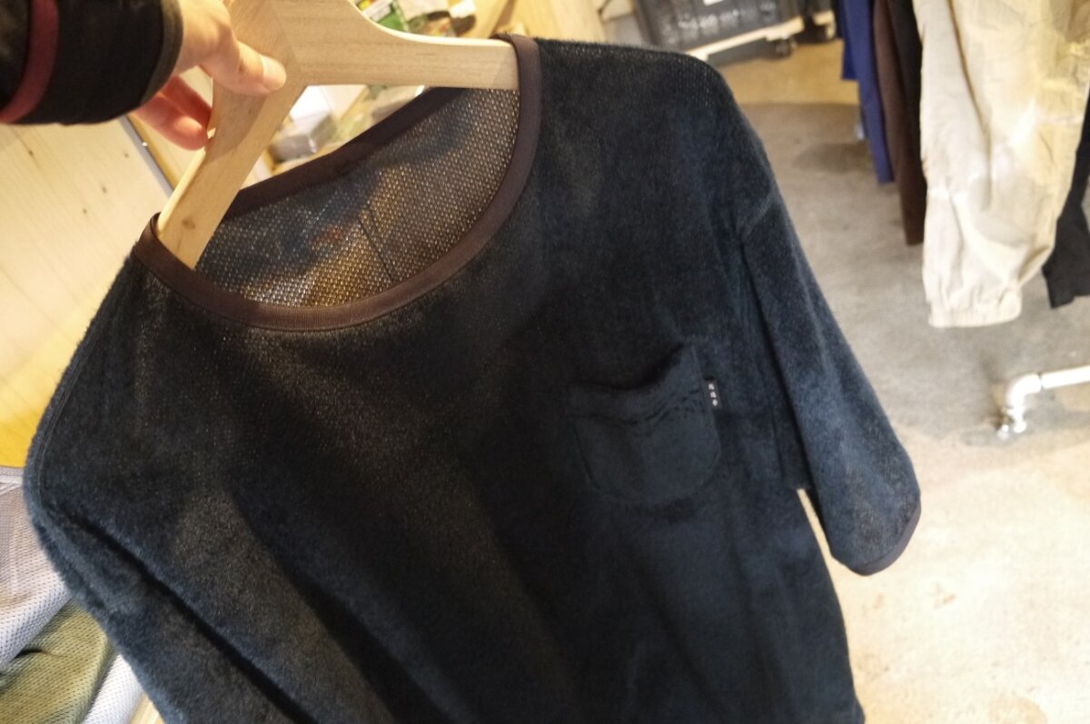 MCS-9 OCTA BASE TEE、大胆にもオクタリバーシブル! の一品。迷迭香としての提案は普段は起毛面を表にして暖かいTシャツとして、山では裏返えしてオクタ本来の汗処理速度と速乾性を機能させるというコンセプト、この辺りの柔軟な発想はガレージならでは。
