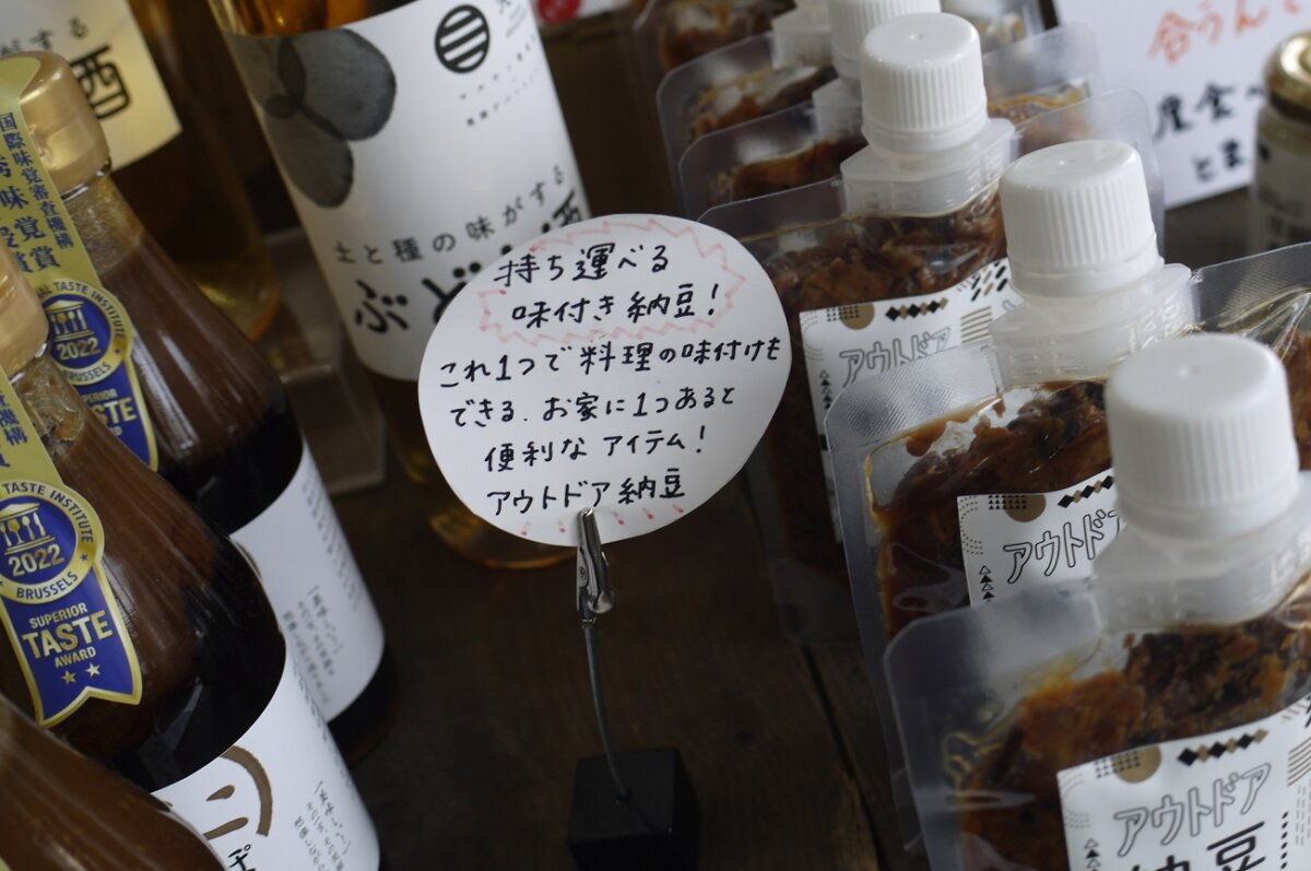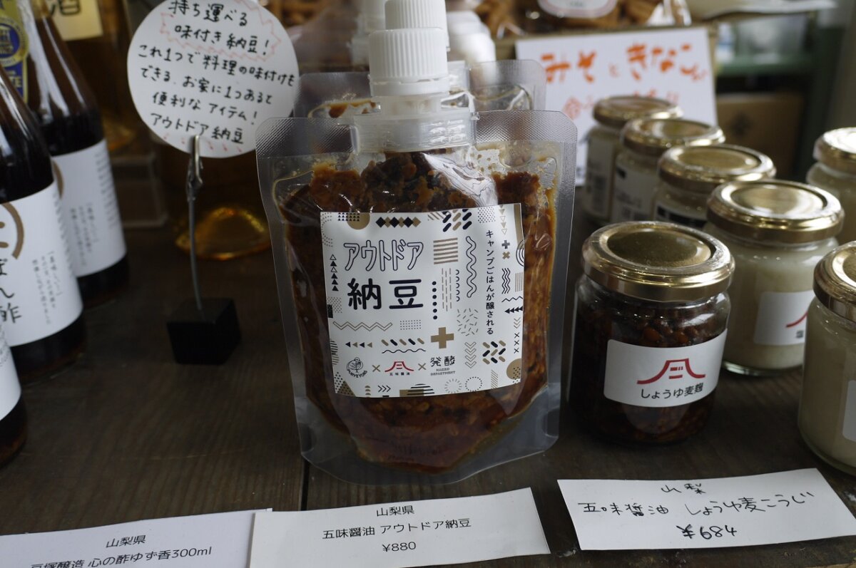 そして数ある製品の中でもかなり人気があるらしいアウトドア納豆!? よく見るとトリプルコラボのロゴのひとつにあの群馬のアウトドアショップパーヴェイヤーズも。