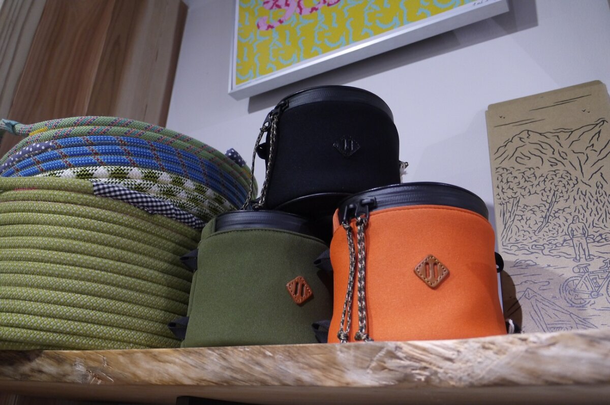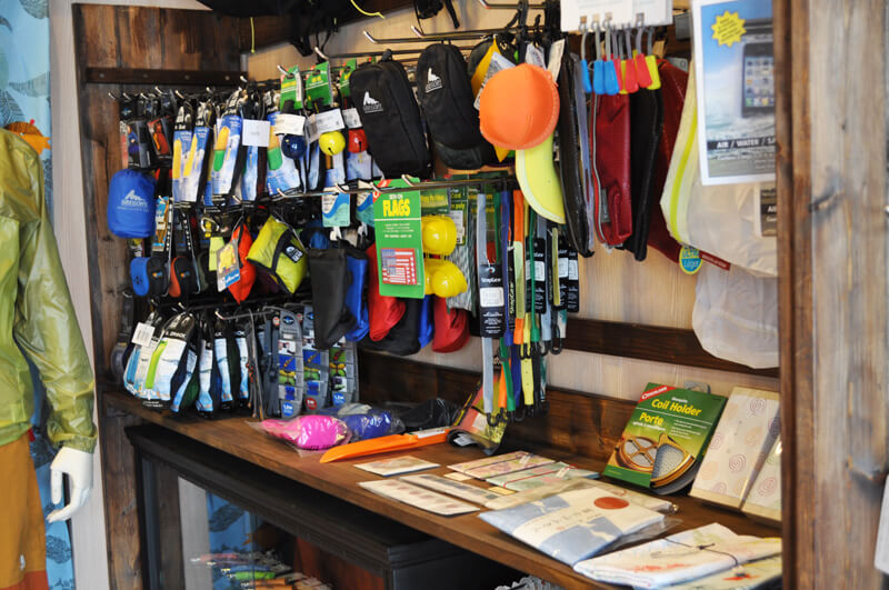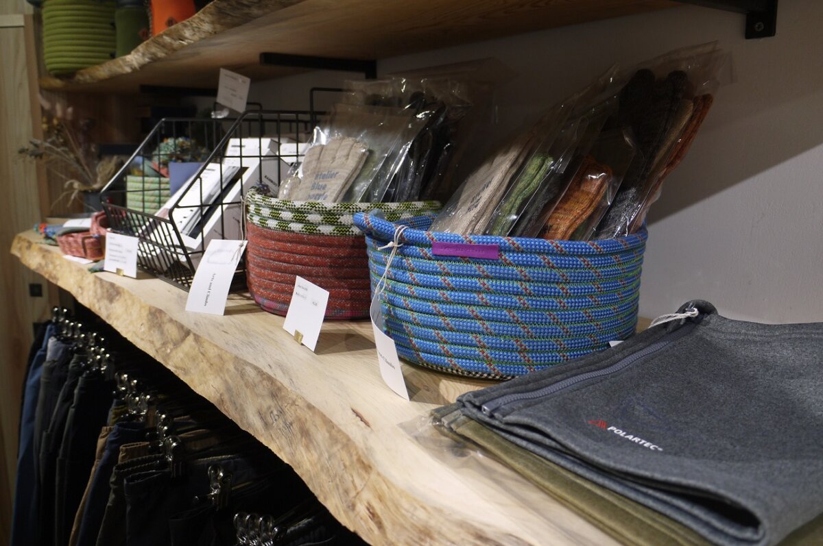 そのまま奥を見ると小物類、のディスプレイに使用しているクライミングロープを再利用したバスケットも売り物のようですこれはアイデア。