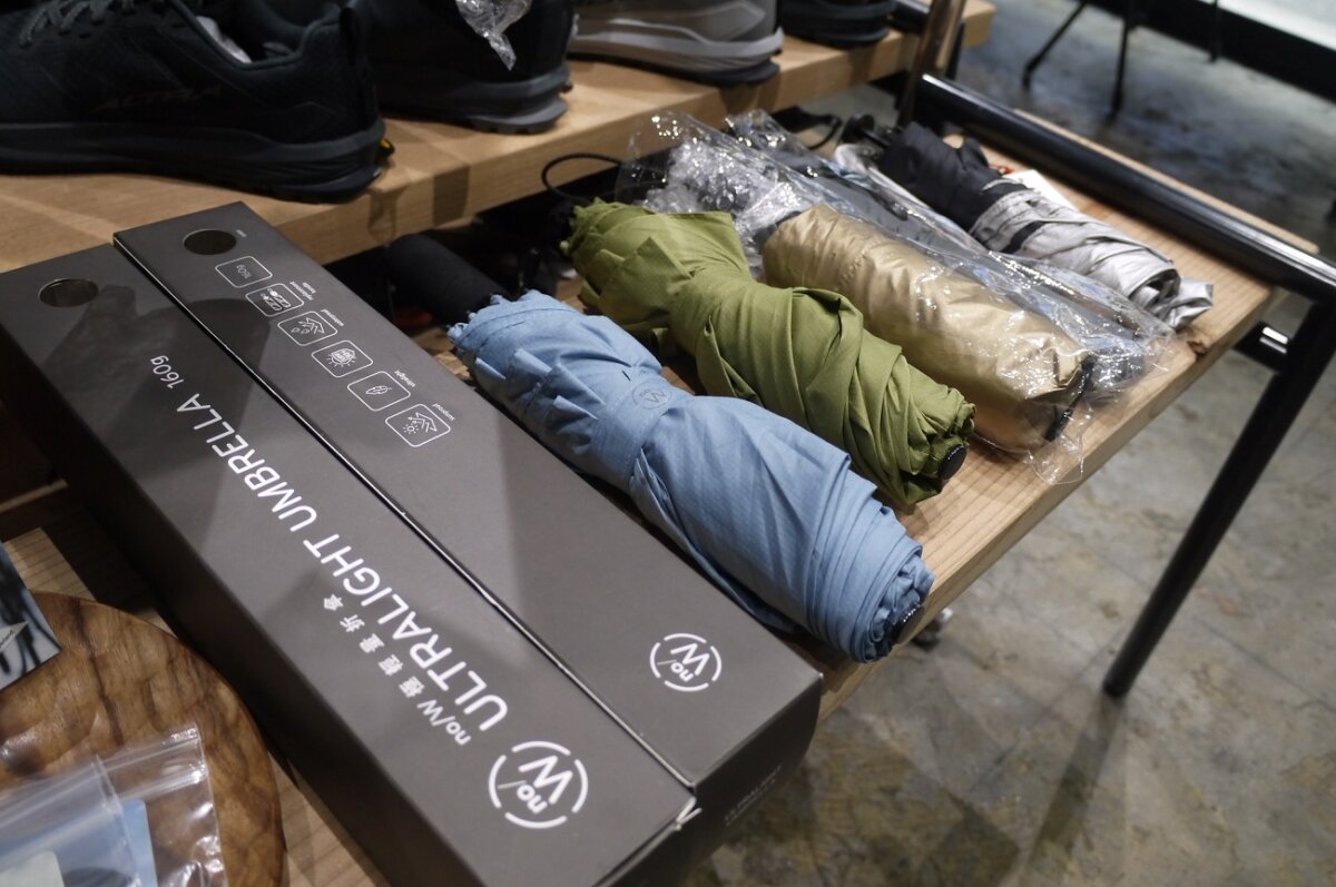 反対側にはこれまた群雄割拠なアウトドアアンブレラ各種、どれもいいものでその選択は悩ましい。