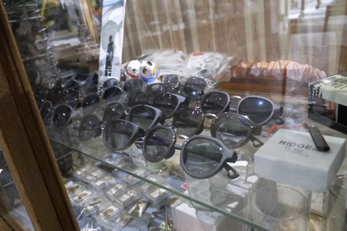 レジカウンター並びで旧店舗からやってきたガラス木棚。