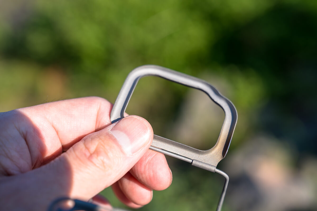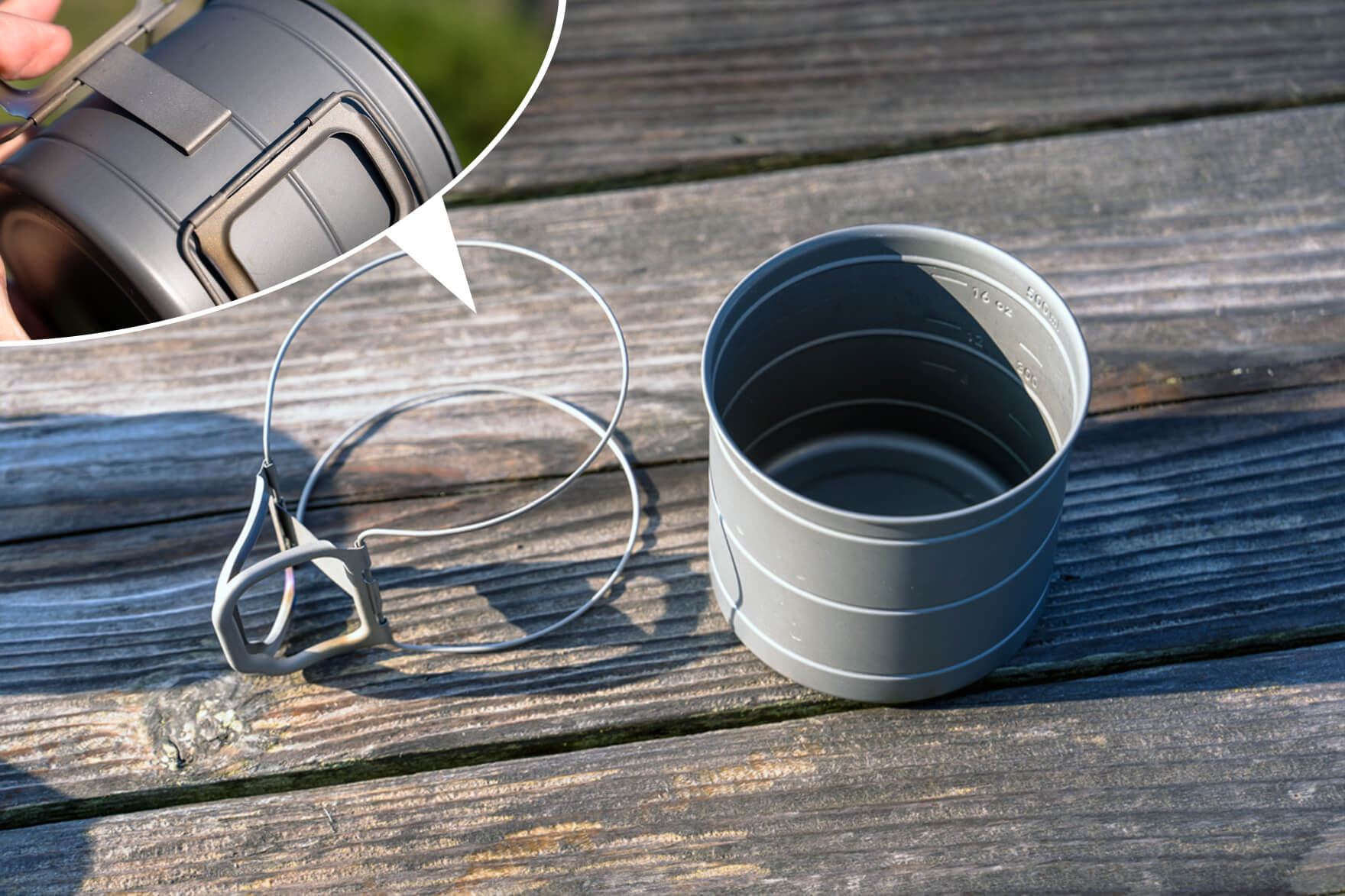 端的に言うと、ポット本体に二本のビード(溝)が掘られ、そのビードにチタン製のハンドル付きワイヤーがハマる構造。これならばハンドルを固定するためのリベット留めや溶接の必要がないので板厚を極限まで薄くすることができ、さらにこのビードは単なるワイヤーの位置を定める溝であるだけでなく、極薄アルミポット本体の強度を高める役割も果たすという、一石二鳥、いやそれ以上に細かな機能性が徹底的に突き詰められた構造なのです。
