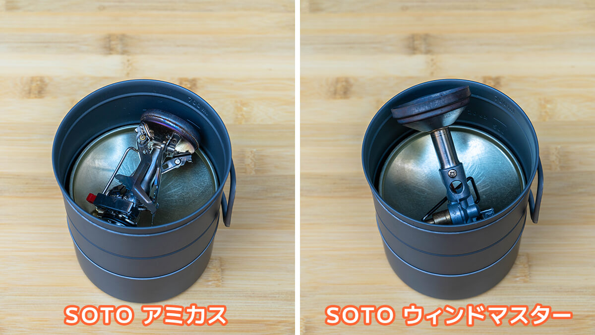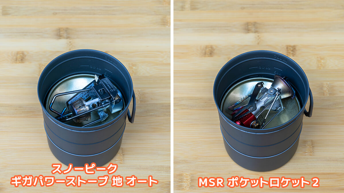 ちなみに、700mlで手元にあるいろいろなガスストーブを収納してみました。自分の持っているストーブと合うかどうか、参考にしてみてください。個人的にはSOTOのウィンドマスターがギリギリ入りそうで入らなかったのが残念ですね。