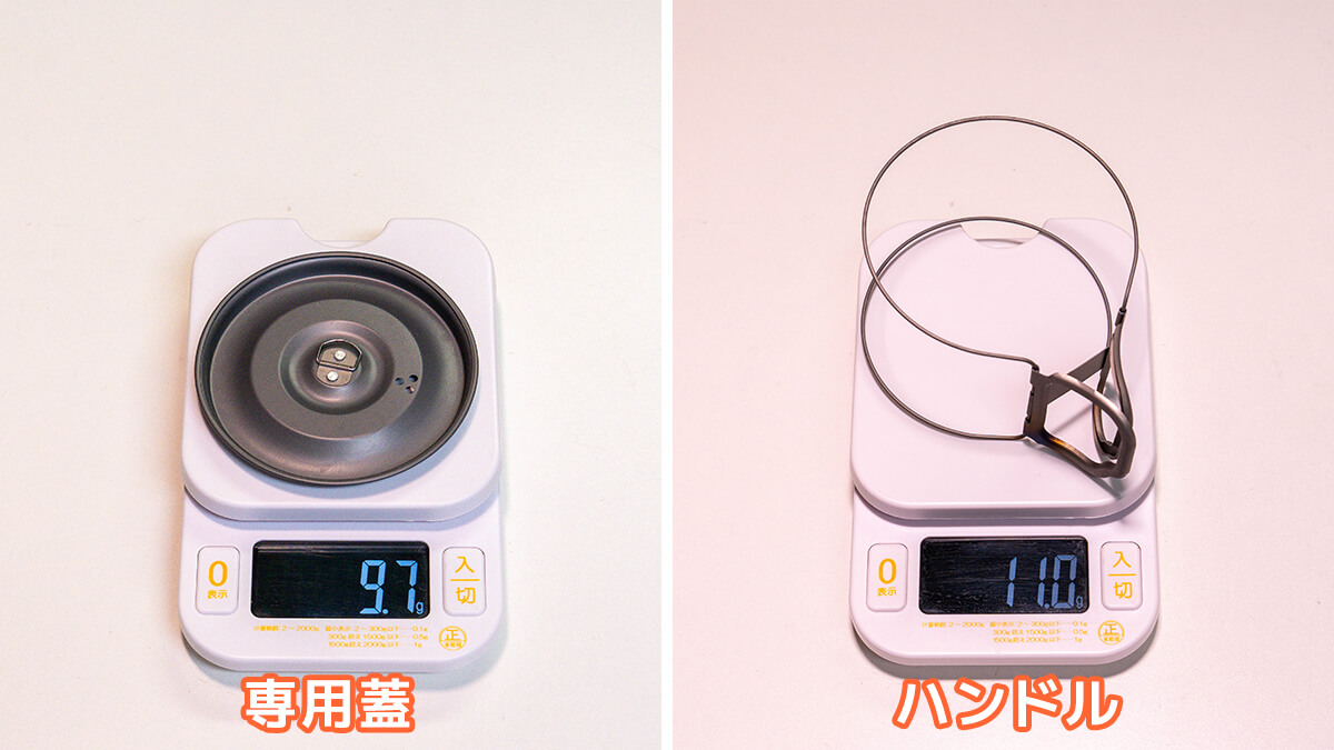 つまり専用蓋・ハンドル付きクッカー世界最軽量のアルミクッカーは、実際のところそれぞれを省略してポット本体だけで使用することだって(理論上は)できます。それぞれの重量はこのような感じ(下写真)。