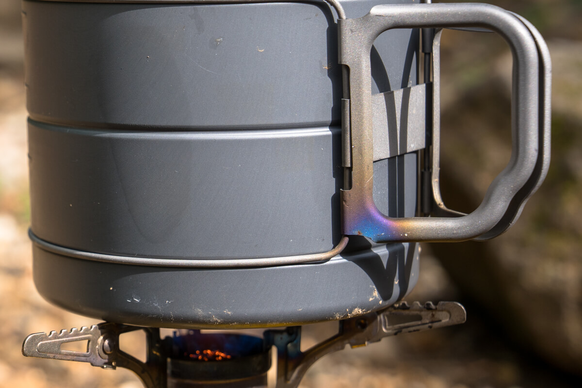ちなみに、何度か使っていてチタンのハンドルの一部が変色していることに気がつきました。熱によって表面の酸化被膜が変化しやすいチタン製品にはまぁありがちなことであり、強度に影響があるわけではないので問題はないのですが、気になる人は一応注意です。