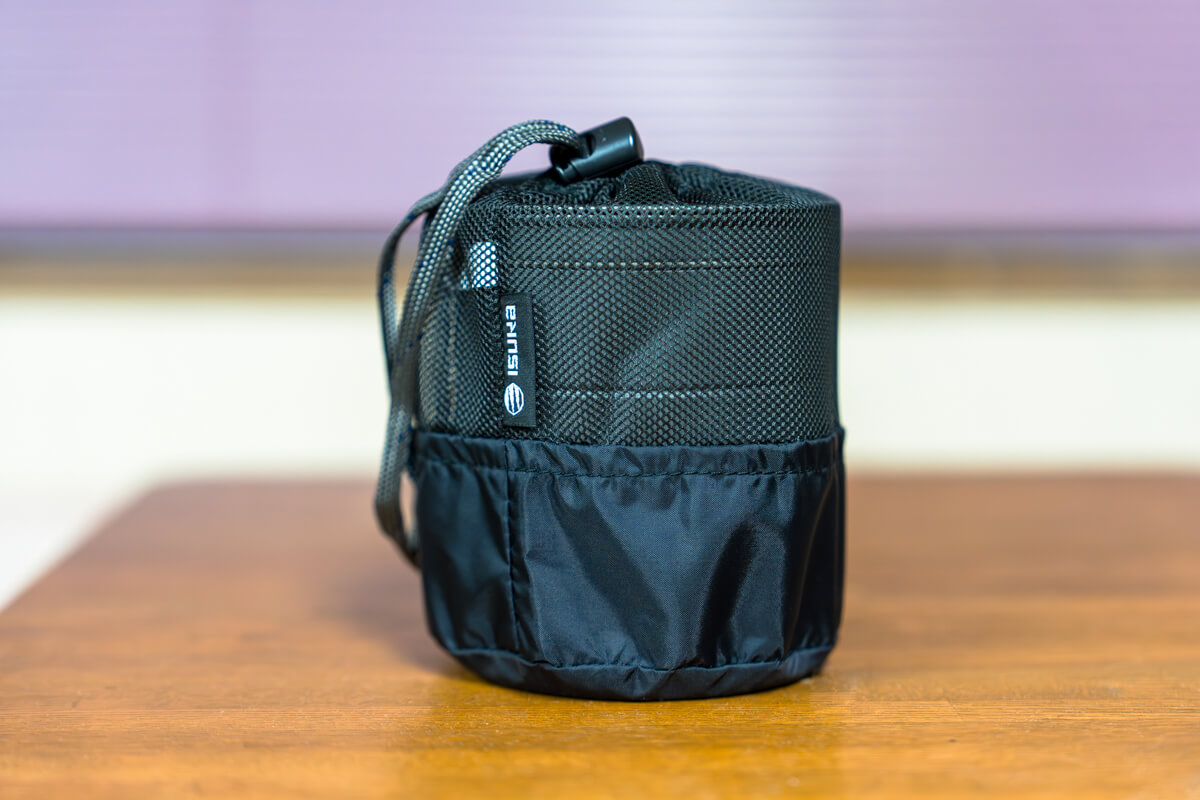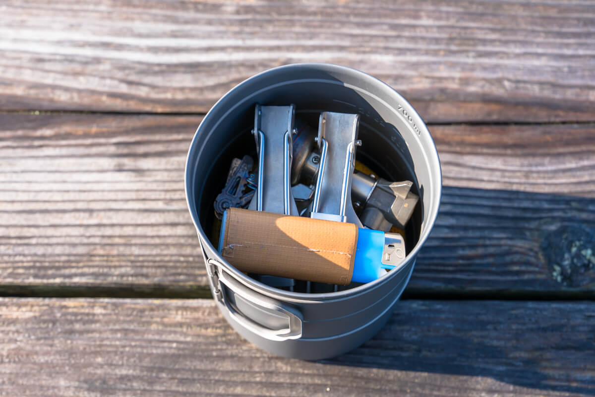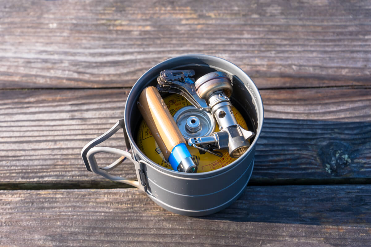 いずれにせよ、個人的には多少蓋が浮いてしまったって大体上手くまとめられれば良いじゃないかというスタイルなので、ポットにストーブ、カトラリー、ライター、折りたたみ式マグカップをすべてまとめて、メッシュのスタッフサックに収納するのが自分流。ちなみにスタッフサックはISUKAの「メッシュ クッカーバッグ S」が500・700mlどちらにも程よくフィットしてくれました。