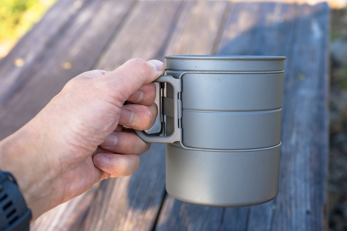 メーカーのHPによればその大きな理由は、クッカーの「ハンドル(取っ手)」を取り付ける際のリベット留めや溶接を十分な強度でで行うためにはどうしてもアルミ合金の場合、一定以上の板厚が必要だったから(板厚をそれ以上薄くできなかったから)なのだとか。チタン製の場合、同じ作りでも板厚をもっと薄くできたので、その結果チタン製クッカーの方が軽くできていたというわけです。