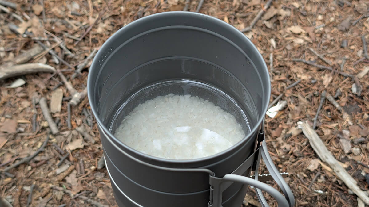 そして個人的にもっとも気になっていた「生米の炊飯」が上手くできるかどうか、さっそく標高1500mにあるテント場で試してみました。米1合と水を入れ、火にかけていきます。