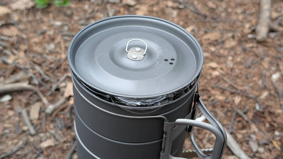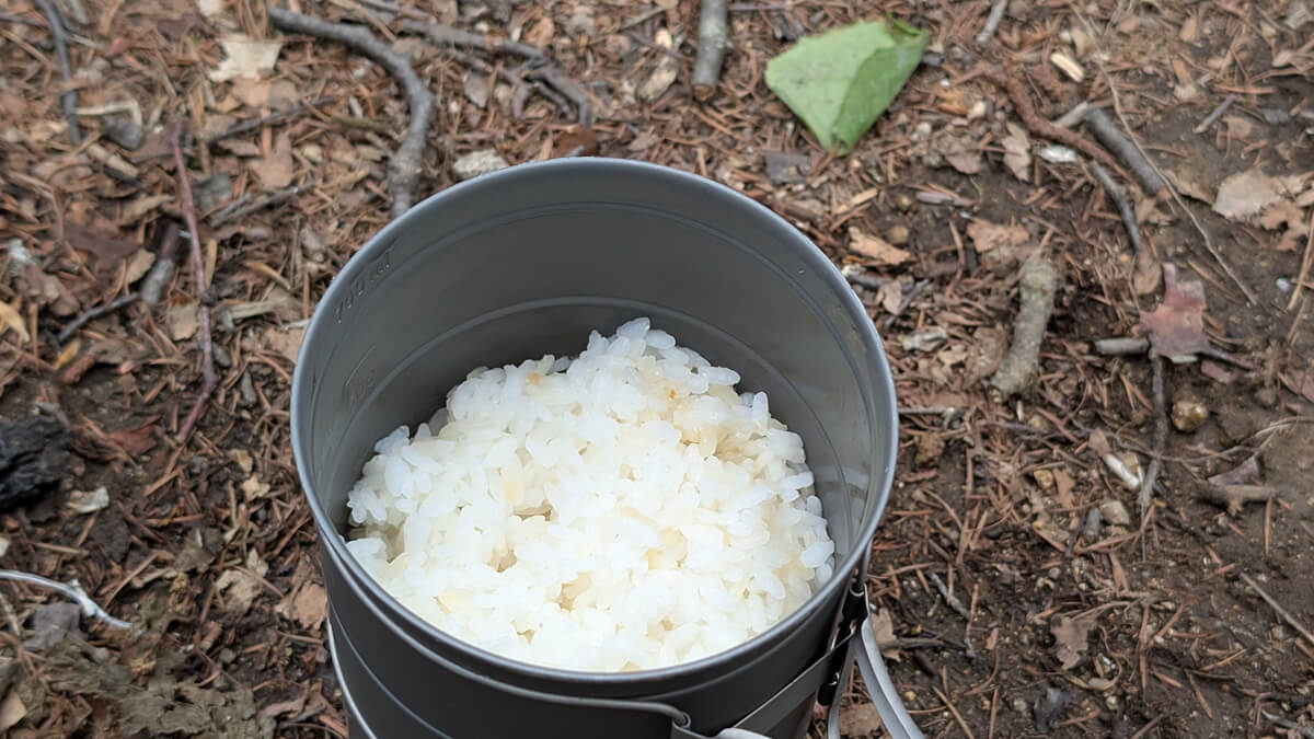 ほどなくして中は沸騰してきましたので、ここからとろ火でしばらく(米を炊くと分かっている場合は、あらかじめ湯切り穴はできれば塞いでおきたいところ)。焦げた臭いがするかしないかのところで火からおろし、タオルで包んで蒸らしました。つまりやったことはこれまでのアルミクッカーでやっていたこととまったく同じです。